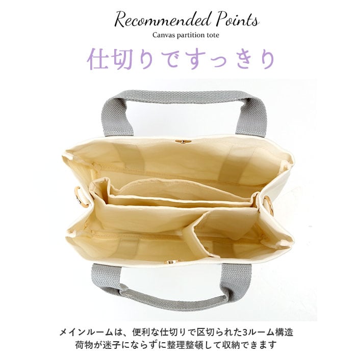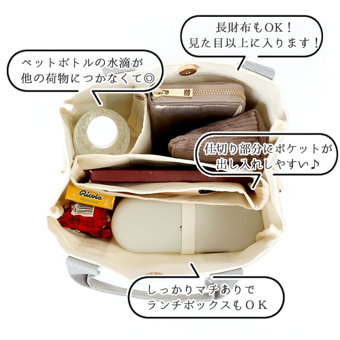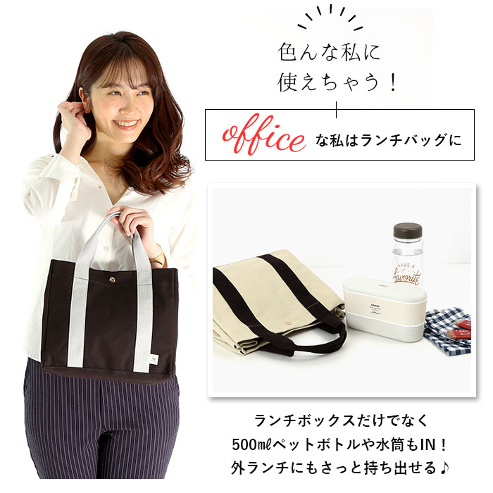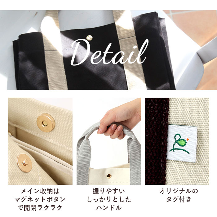 | 商品説明 | ナチュラルなキャンバス素材を使用した、2WAYミニトートが登場。「バックヤードファミリー)」オリジナルロゴのタグがワンポイント♪コンパクトながらもマチが程よく取られ、バッグがしっかりと自立!ランチボックスが平置きにできる他、500mlのペットボトルも縦置きに収納できる使い勝手のいいサイズ感。メインルームは、便利な仕切りで区切られた3ルーム構造で、小物の整理が楽ちん♪仕切りは、荷物のサイズに合わせてスナップボタンで着脱可能。仕切りの中央部分がスリムな縦型ポケットになったユニークな作りで、スマホや手帳が立てて収納できるのが嬉しいポイント。仕切り側面にも便利なオープンポケット×1を配置。バッグ開口部は、スムーズに開閉のできるマグネットボタン式で、小物が飛び出す心配が少なく安心。調節可能なショルダーベルトで、手持ちにも肩掛けにもできる2WAY仕様。シーンに合わせてスタイリングが自在♪無地のシンプルなデザインなので、通勤・通学時のランチトートやデイリー使いに最適。 |