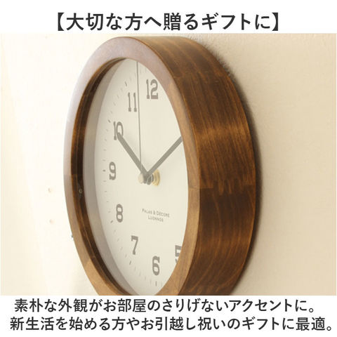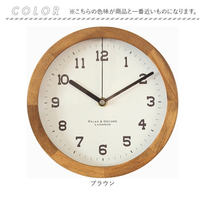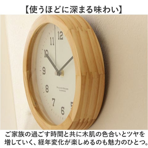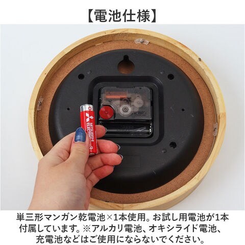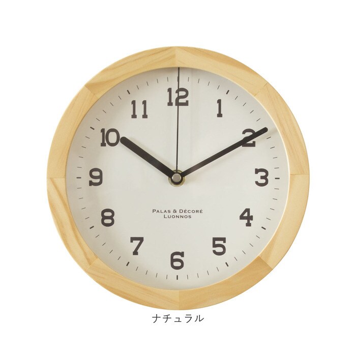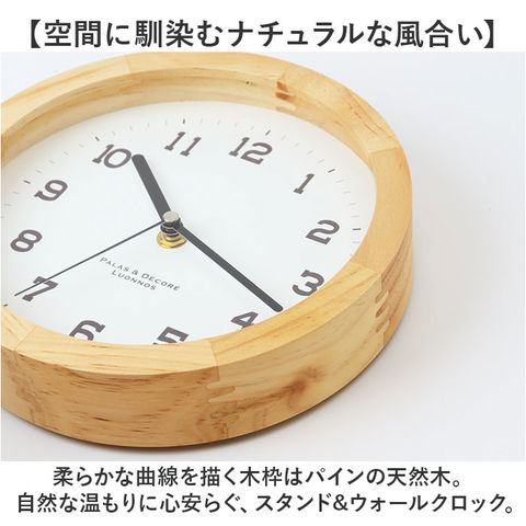 商品説明【木の温もりにそっと包まれる】天然の無垢材の素材感で、お部屋がナチュラルな北欧テイストに。「アイナ ウッドクロック(M)」【空間に馴染むナチュラルな風合い】柔らかな曲線を描く木枠はパインの天然木。自然な温もりに心安らぐ、スタンド&ウォールクロック。【シンプルでパッと見やすい文字盤】真っ白な文字盤に丸みのある数字を並べ、お子様も大人もパッと時間が読みやすい程よいサイズ感。【静かなおうち時間を過ごしたい方に】カチコチ音のしないスイープムーブメントを採用。寝室やテレワークをするための書斎に最適。【置き・掛け兼用タイプ】スタンドパーツでテーブルやベッドサイドに置けるほか、背面の“壁掛け穴”で壁掛けにしてもOK!【長く使える丈夫なつくり】木枠は寄木細工のようなフィンガージョイント仕上げだから、安定した強度で長く愛用できる造り。【使うほどに深まる味わい】ご家族の過ごす時間と共に木肌の色合いとツヤを増していく、経年変化が楽しめるのも魅力のひとつ。【お部屋に合わせて選べる素材感】木目の風合いが柔らかな印象を与える“ナチュラル”に、深みのある木肌に心が落ち着く“ブラウン”。お部屋のテイストに合わせて選べるカラーバリエーション。【大切な方へ贈るギフトに】素朴な外観がお部屋のさりげないアクセントに。新生活を始める方やお引越し祝いのギフトに最適。【電池仕様】単三形マンガン乾電池×1本使用。お試し用電池が1本付属しています。※アルカリ電池、オキシライド電池、充電池などはご使用にならないでください。