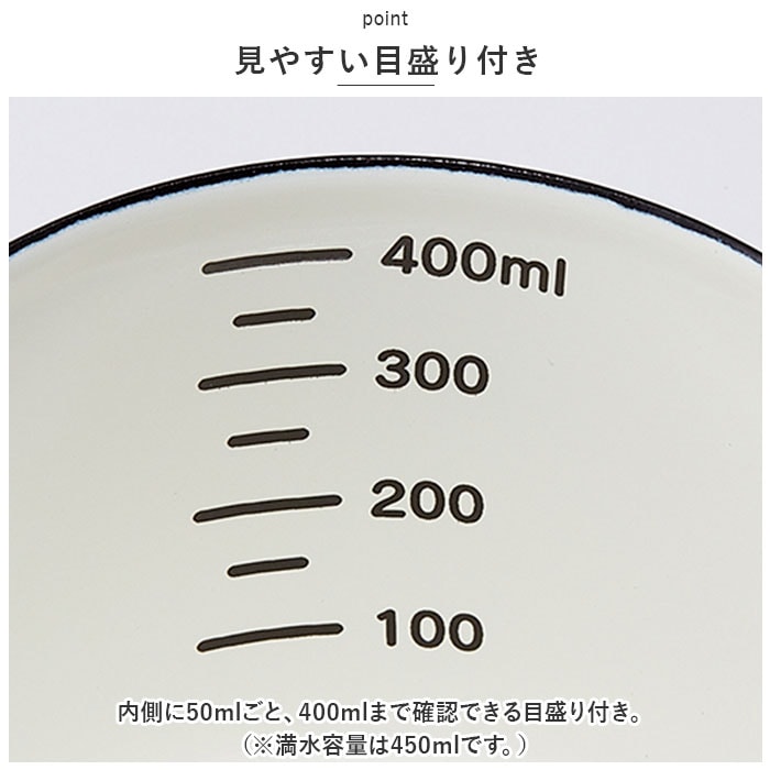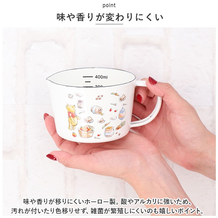 | 商品説明 | キャラクターデザインがPOPで可愛い♪ホーローメジャーカップが発売♪(最大約450ml)【味や香りが変わりにくい】味や香りが移りにくいホーロー製。酸やアルカリに強いため、汚れが付いたり色移りせず、雑菌が繁殖しにくいのも嬉しいポイント。【毎日活躍】普段の料理やお菓子作り等、調味料・ドリンクの調整で大活躍◎【見やすい目盛り付き】内側に50mlごと、400mlまで確認できる目盛り付き。(※満水容量は450mlです。)【インテリアとしても】置いておくだけでキッチンの雰囲気が明るくなる、POPなキャラクター達とマッチしたおしゃれなデザインをラインナップ。【ギフトにも】ご自宅用はもちろん、化粧箱に入っており大切な方や母の日のプレゼントにも最適☆ |