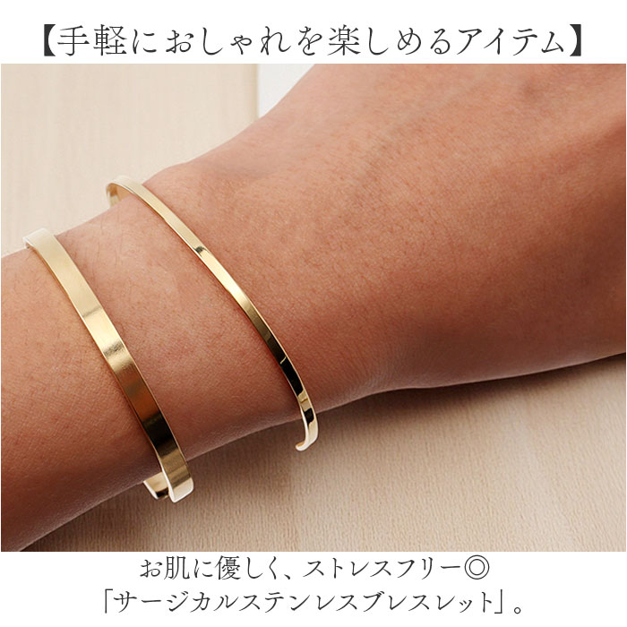 | 商品説明 | 【手軽におしゃれを楽しめるアイテム】お肌に優しく、ストレスフリー◎「サージカルステンレスブレスレット」。【身体に優しいサージカルステンレス】金属アレルギーを起こしにくく、人体に優しい素材を採用。サビや変色が少なくデイリーに活躍。(※)すべての方にアレルギー反応が出ない商品ではありません。【着脱しやすいバングルタイプ】そっと広げて手首に通し、お好みの位置で閉じて装着。若干のサイズ調節もできるのが嬉しい◎【いつものコーデをさりげなく格上げ】どんなスタイルにも合わせやすい、シンプルなデザイン。手首に上品なアクセントを♪ |