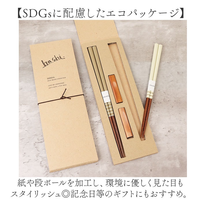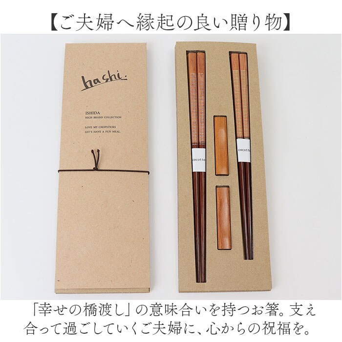 | 商品説明 | 【いつもの食卓に素敵にマッチ】デイリー使いしやすいシンプルなデザイン。エコでおしゃれな「エシカルBOX」。【ご夫婦やカップルでお揃いに】カラーとサイズの異なるお箸&箸置きのセット。2人仲良く使えて、毎日の食事がもっと豊かに。【SDGsに配慮したエコパッケージ】紙や段ボールを加工し、環境に優しく見た目もスタイリッシュ◎記念日等のギフトにもおすすめ。【職人技が光る!伝統の若狭塗箸】福井県小浜市で生産される伝統工芸品の漆器の技法を。風合いのある天然木と相性抜群。(※)ココットの持ち手部分は、ザラッとした滑りにくい質感です。【アクセントになる箸置き】お箸と合わせやすい、ナチュラルな箸置き。食卓の雰囲気が、ワンランクアップ!【傷を防げてデイリー使いに最適】お箸も箸置きも天然木の素地に塗装を施すことで、傷つきをガード。毎日の食事のお供に。【ご夫婦へ縁起の良い贈り物】・「幸せの橋渡し」の意味合いを持つお箸。支え合って過ごしていくご夫婦に、心からの祝福を。 |