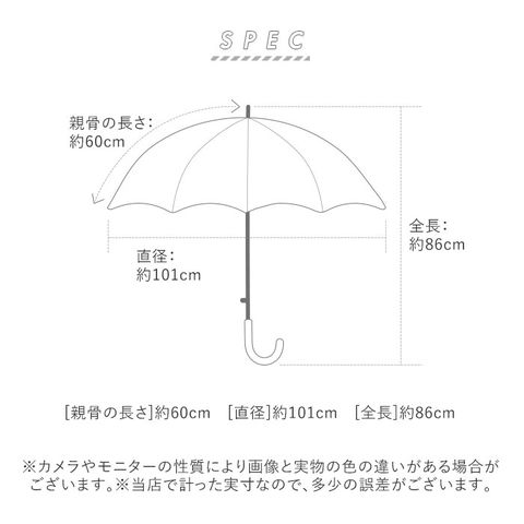 | サイズ | [親骨の長さ]約60cm/[直径]約101cm/[全長]約86cm ※サイズは当店計測の実寸サイズです。実際の商品ならびにメーカー表記サイズとは多少の誤差が生じる場合がございます。あらかじめご了承ください。 |