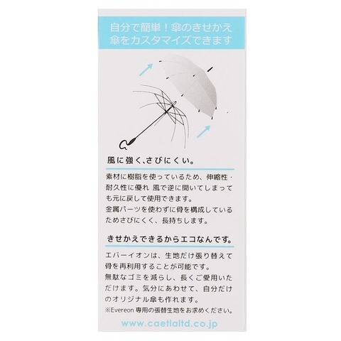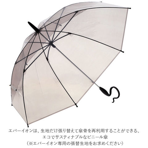 | 商品説明 | 傘生地をお好みの色に簡単着せ替え♪ポップでユニークな長傘Evereon(エバーイオン)にシンプルな無地シリーズが新登場。エバーイオンは、生地だけ張り替えて傘骨を再利用することができる、エコでサスティナブルなビニール傘。(※エバーイオン専用の張替生地をお求めください)生地が傷んだら、様々な柄の張替生地に着せ替え、自分だけのオリジナル傘にカスタマイズ。親骨素材には柔軟で耐久性に優れたグラスファイバー樹脂を使用し、強い風でひっくり返ってもすぐに元通り!傘骨に金属パーツを使用していないため、ビニール傘なのにサビにくく長く使えて、お財布にもとっても優しい。スムーズに傘生地が開く手開きタイプ。石突もつゆ先も先端が丸くデザインされているので、混雑した場所でも安全。手に馴染んで持ちやすい特徴的な持ち手ハンドルがデザインのワンポイント!テーブルの縁など様々な場所にサッと掛けられるユニークなフォルムで、手首にも優しくフィット。ハンドルと傘骨、傘生地の色味を統一したシンプルで飽きの来ないカラーリングが、どんな服装にも素敵にマッチ。ハンドルに刻印された「Every cloud has a silver lining」(どんな困難な状況でもいつかは光が射しこんでくる)という意味の諺が、憂鬱な雨の朝もそっと背中を押してくれる! |