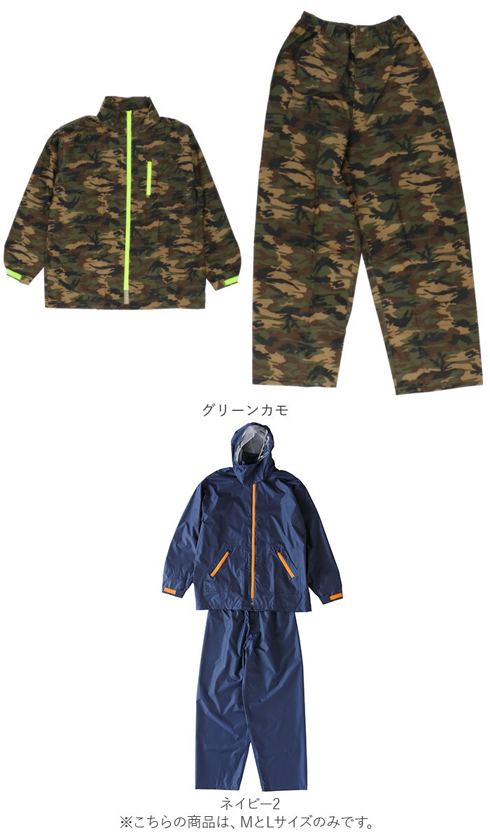 | 商品説明 | こだわりの機能を取り揃えた「レインスーツ上下セット」が新登場!上着は首元のスナップボタンでフードの取り外しが可能。フード背面には反射テープ付き。スマホがすっぽり入るファスナーポケットを腰の高さ左右に配置。(CAMO(迷彩)の上着は胸ポケットのみのデザインになります)袖口は二重袖+面ファスナー仕様で雨の侵入をしっかり防ぐつくり。アウターの内側には嬉しい消臭ネーム付き!パンツはウエストゴム入り♪前開きジップ付きのデザインで着脱しやすい仕様。ベルトループが付いているからお好みでベルト装着もできる。裾口はスナップボタンで裾幅を調節可能。上下ともに総裏メッシュ生地を採用。蒸れやベタ付きを緩和し快適なサラサラな着心地をキープ。シンプルなシルエットに仕上げ男女ともに着用しやすいユニセックスデザイン。 |