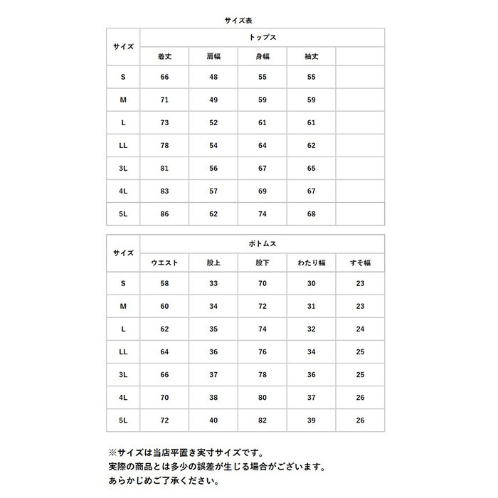 | 重量 | 【トップス】約510g 【ボトムス】約367g ※LLサイズの商品の重量です。 |