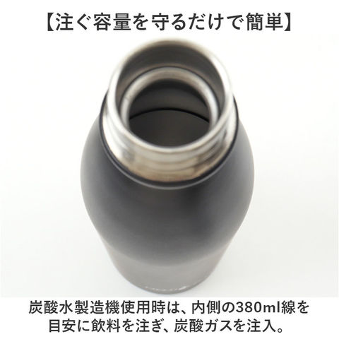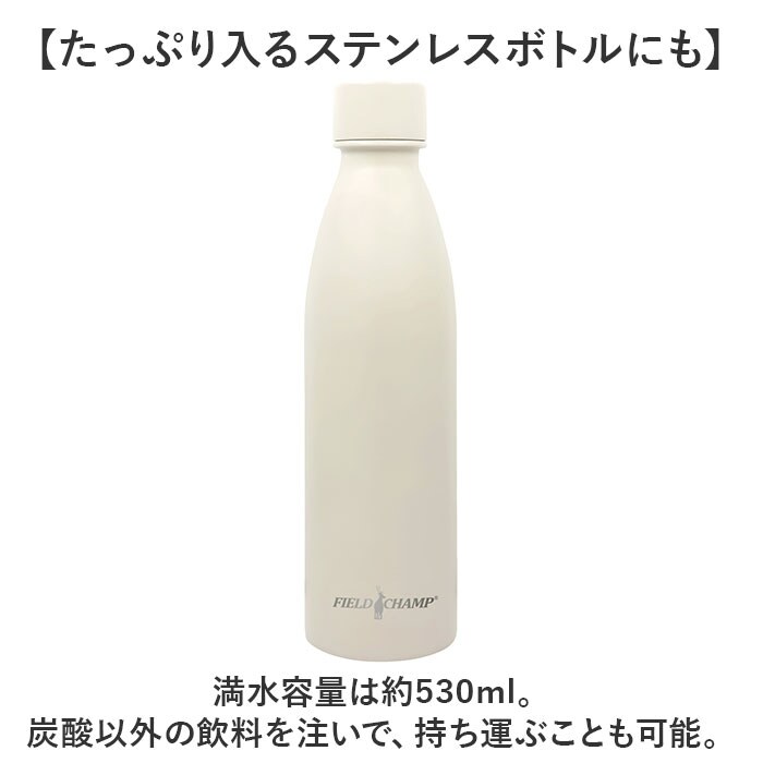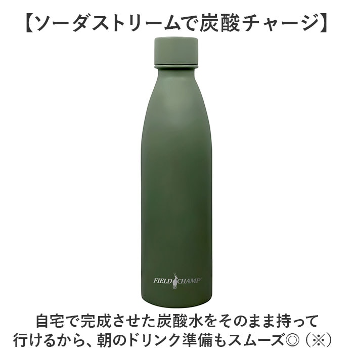 | 商品説明 | 【お気に入りのドリンクを持ち運び】炭酸もお任せ☆お好きなドリンクを手軽に!「FIELD CHAMP 炭酸ボトル」。【ソーダストリームで炭酸チャージ】自宅で完成させた炭酸水をそのまま持って行けるから、朝のドリンク準備もスムーズ◎(※)ソーダストリーム(R)対応ボトルです。その他のメーカーの炭酸水製造機には対応しておりません。【注ぐ容量を守るだけで簡単】炭酸水製造機使用時は、内側の380ml線を目安に飲料を注ぎ、炭酸ガスを注入。【安心安全なエアースリット機能】本体の溝から炭酸ガスが通り抜ける!振動による漏れや噴出を防ぎ、フタが浮き上がる心配不要◎【たっぷり入るステンレスボトルにも】満水容量は約530ml。炭酸以外の飲料を注いで、持ち運ぶことも可能。【保温保冷両用でオールシーズン活躍】本体内側と外側が真空断熱された、ステンレス2重構造タイプ。温冷共に飲み頃温度をキープ!【ゴクゴク直飲みできて便利】キャップはスムーズに開閉。いつでもどこでも、ダイレクトに水分補給☆【お手入れしやすいシンプル設計】フタパッキンは取り外しOK。少ないパーツでお手入れの手間を省けて、デイリー使いに最適。【飽きが来ず長く使える万能アイテム】学生時代から大人になっても愛用!マットな質感で落ち着きのある仕上がり。 |
