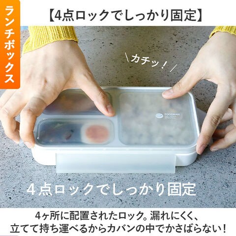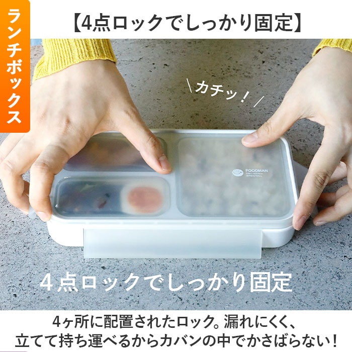 | 商品説明 | 【毎日のお弁当を快適に持ち運べる!】大活躍の「FOODMAN 抗菌薄型弁当箱 400mlサイズ&ランチラッパー」2点セット。《抗菌薄型弁当箱 400ml》【バッグにすっぽり持ち運びスマート】A4サイズと同じ幅で、厚みは約3.5cm。カバンに立てて収納でき、ランチトートいらず。【汁漏れガード!Wシーリング構造】本体周囲&中仕切りもシーリング!汁漏れだけでなく、各スペースの汁移りや味移りも防止。【ふわっと盛っておいしさアップ】本体から上にはみ出た分もしっかり入る、ドーム形状の蓋。押し潰れを防いで見た目もキレイ♪【盛り付け簡単◎ワンプレート設計】一体型固定の中仕切りに、食材を分けて詰めるだけ。悩むことなく楽しく盛り付け☆【女性やお子さまに最適な400ml】コンパクトでスリムなフォルム。お茶碗約2杯分が入るサイズ感。(※)お茶碗1杯を約180mlとして計算した場合の容量です。【見栄えがアップするホワイトカラー】内側器部分は、鮮やかな食材の色を際立てる白色。ワンプレートディッシュのような仕上がり。【食べやすく洗いやすい丸型コーナー】おかずもご飯もすくいやすい!汚れも溜まりにくく、洗浄がラクラク。【一体パッキンで取り外す手間いらず】蓋とパッキンが一体成形。蓋との間に汚れが入りにくく、洗う時もパッキンはそのままでOK。【オフィスでも熱々ごはんを味わえる】蓋を外して電子レンジでの温め可能。温め直せば、いつでもあったかごはんを楽しめる!【お手入れしやすく衛生的】抗菌加工済み&うれしい食洗機対応。忙しい毎日の味方。【4点ロックでしっかり固定】・4ヶ所に配置されたロック。漏れにくく、立てて待ち運べるからカバンの中でかさばらない!《多機能ランチラッパー》【風呂敷のように使い勝手抜群】四隅を中心に向かって折り込むだけ◎薄型弁当箱を優しく包み込むアイテム。【どこでもくっつくラッピング構造】四隅に面ファスナーを装備!お子さまでもサッとまとめられて安心。 |