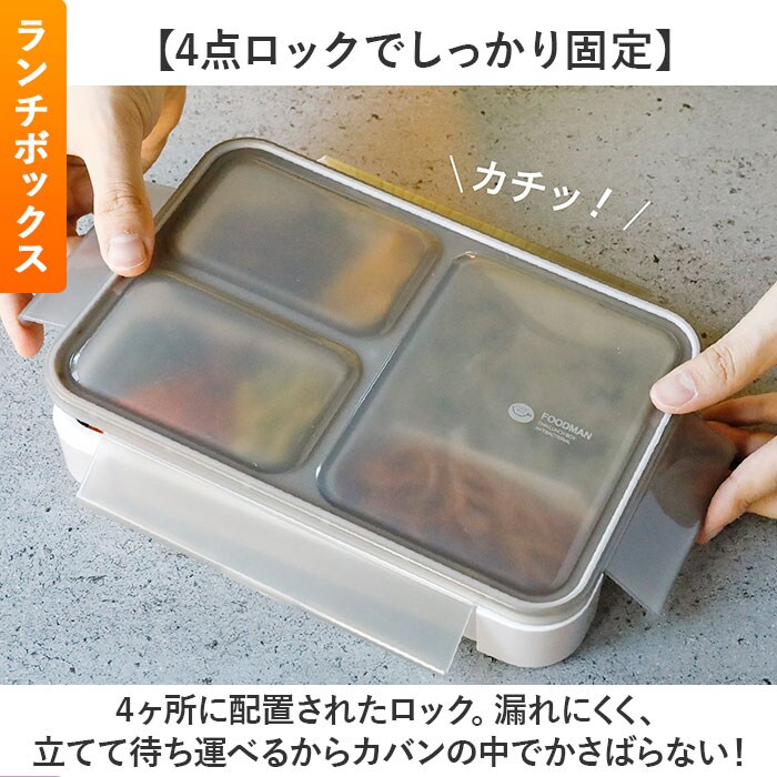 | 商品説明 | 【毎日のお弁当を快適に持ち運べる!】FOODMANの抗菌薄型弁当箱 600mlサイズ&ランチラッパー&抗菌箸3点セット。《抗菌薄型弁当箱 600ml》【バッグにすっぽり持ち運びスマート】A4サイズと同じ幅で、厚みは約3.6cm。カバンに立てて収納でき、ランチトートいらず。【汁漏れガード!Wシーリング構造】本体周囲&中仕切りもシーリング!汁漏れだけでなく、各スペースの汁移りや味移りも防止。【ふわっと盛っておいしさアップ】本体から上にはみ出た分もしっかり入る、ドーム形状の蓋。押し潰れを防いで見た目もキレイ♪【盛り付け簡単◎ワンプレート設計】一体型固定の中仕切りに、食材を分けて詰めるだけ。悩むことなく楽しく盛り付け☆【レイアウト自在!可動式中仕切り】可動できる中仕切りが1つ付属。おかずやご飯のレイアウトをお好みでチェンジ。(※1)可動式中仕切りにシーリング機能はついておりません。【男性も女性も使いやすいサイズ】コンパクトなフォルムだけど、容量はたっぷり600ml。お茶碗約3杯分が入るサイズ感。(※2)お茶碗1杯を約180mlとして計算した場合の容量です。【見栄えがアップするホワイトカラー】内側器部分は、鮮やかな食材の色を際立てる白色。ワンプレートディッシュのような仕上がり。【食べやすく洗いやすい丸型コーナー】おかずもご飯もすくいやすい!汚れも溜まりにくく、洗浄がラクラク。【一体パッキンで取り外す手間いらず】蓋とパッキンが一体成形。蓋との間に汚れが入りにくく、洗う時もパッキンはそのままでOK。【オフィスでも熱々ごはんを味わえる】蓋を外して電子レンジでの温め可能。温め直せば、いつでもあったかごはんを楽しめる!【4点ロックでしっかり固定】・4ヶ所に配置されたロック。漏れにくく、立てて待ち運べるからカバンの中でかさばらない! |