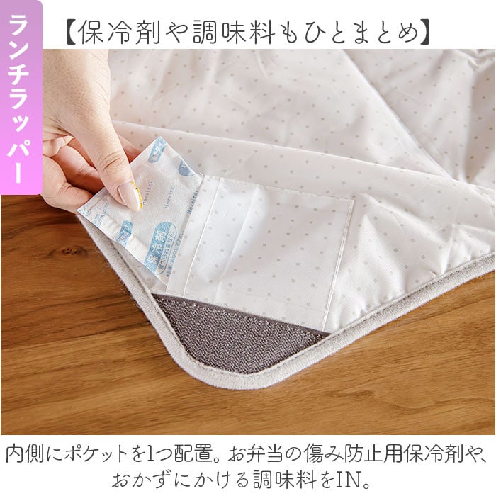 | 注意点 | 【保冷剤や調味料もひとまとめ】内側にポケットを1つ配置。お弁当の傷み防止用保冷剤や、おかずにかける調味料をIN。【内側にも嬉しい機能を搭載】保冷効果に、汚れがつきにく撥水コート。クッション性のある中綿入りで、衝撃をガード!【手洗いできて清潔をキープ】汚れが気になったら、自宅で手洗い◎お手入れもサクッと完了。【弁当箱800ml】電子レンジ:可 (蓋は使用不可) 食洗機:可 (蓋は使用可)【ランチラッパー】手洗い 可 ドライクリーニング 不可乾燥機 不可お取り扱いの際は、商品やパッケージなどに記載されている品質表示、アテンションタグ、ご使用上の注意事項などを必ずご確認下さい。本来の目的以外にはご使用にならないで下さい。カメラやモニターの性質により、画像と実物の色の違いがある場合がございますのでご理解願います。 |