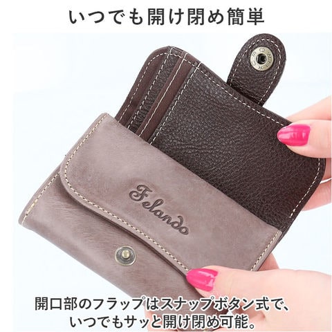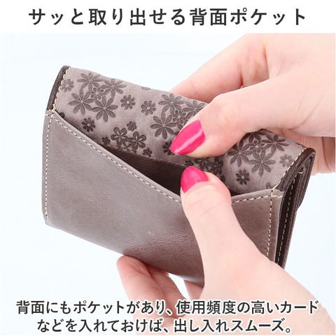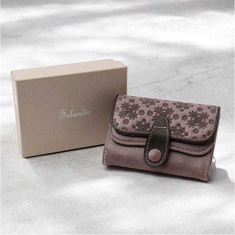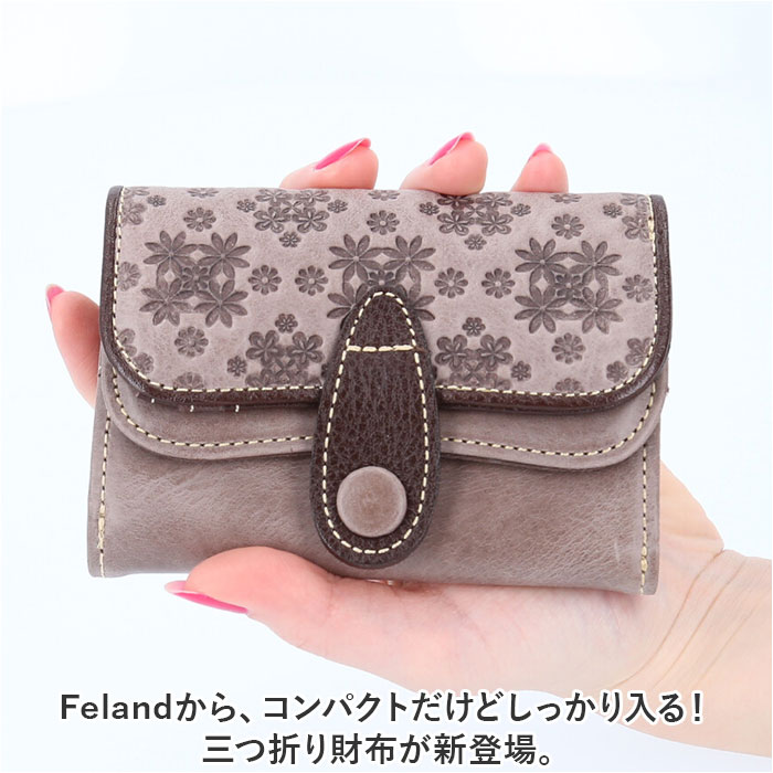 | 商品説明 | Felandから、コンパクトだけどしっかり入る!三つ折り財布が新登場。【長く愛用できる柔らかな牛革製】自然な風合いで使うほどに味わいが増す牛革素材。メインレザーはオイルワックスを手塗りし、パラフィン加工を。サブは染料染めにエンボス加工をプラス。【上品な可愛らしさが光るデザイン】フラップ部分に施された、フラワーデザインがポイント。落ち着きがありつつ、愛らしい雰囲気に。【うれしいコンパクトサイズ】ミニマルに収まる三つ折り仕様。ミニバッグやアウターのポケットにすっぽり!キャッシュレス派にも嬉しいサイズ感。【いつでも開け閉め簡単】開口部のフラップはスナップボタン式で、いつでもサッと開け閉め可能。【ガバっと開くボックス型小銭入れ】フラップを開くと、大きく開く小銭入れ。スナップボタン開閉式のボックスタイプで、小銭のこぼれ落ちをガード。【お札もカードもすっきりひとまとめ】お札やレシートを仕分けたり、カードを見やすく収納できるポケットを配置。【サッと取り出せる背面ポケット】背面にもポケットがあり、使用頻度の高いカードなどを入れておけば、出し入れスムーズ。【お気に入りを選べるバリエーション】年代問わず持ちやすい、大人なカラーをラインナップ。ボックス入りでギフトにもおすすめ。【ポケット仕様】内側:小銭入れ×1、お札入れ×2、カードポケット×3、フリーポケット×2背面:フリーポケット×1 |