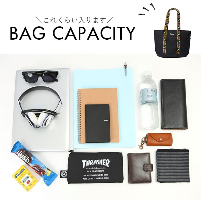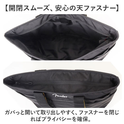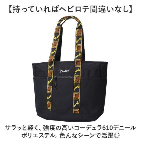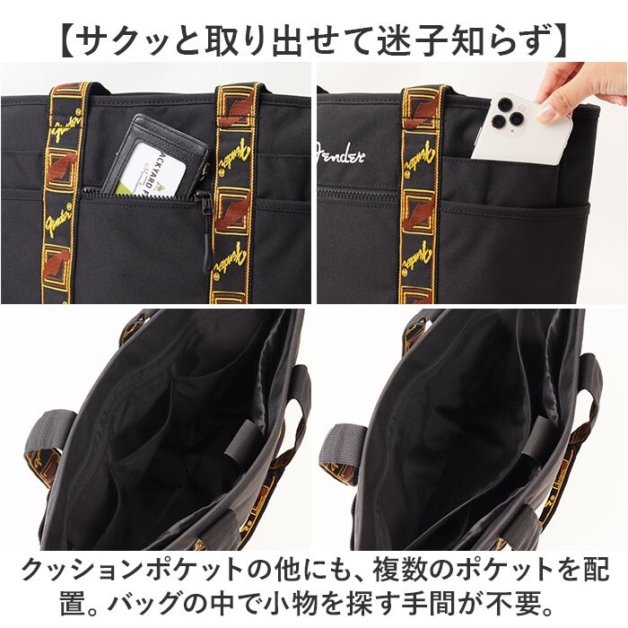 | 商品説明 | 【ギターや音楽好きの心をくすぐる!】ヴィンテージテイストなデザインが、コーデのアクセントに。「Fender トートバッグ」。【音楽好き必見Fenderアイテム】フェンダーストラップの代名詞”モノグラムストラップ”を再現して、ハンドルにアレンジ☆【持っていればヘビロテ間違いなし】サラッと軽く、強度の高いコーデュラ610デニールポリエステル。色んなシーンで活躍◎【肩掛けできてストレスフリー】ハンドルは、肩に掛けられる長さに設計。荷物が重くなっても大丈夫。【開閉スムーズ、安心の天ファスナー】ガバっと開いて取り出しやすく、ファスナーを閉じればプライバシーを確保。【A4対応◎ざっくりひとまとめ】A4サイズが横向きに。マチもしっかりあり、お出かけに必要な荷物はこれ1つにすっきり!(※)B4サイズも収納可能ですが、角が折れてしまう可能性があります。【タブレットOK。通勤・通学用にも】ベルト付きのクッションポケットを装備。タブレットやミニノートPCをラクラク持ち運び♪【サクッと取り出せて迷子知らず】クッションポケットの他にも、複数のポケットを配置。バッグの中で小物を探す手間が不要。【程よいクッションで衝撃をガード】外側にクッションをプラス。外部の衝撃から守り、収納物を傷つけにくいつくり。【お揃いで使えるユニセックス仕様】性別・年代問わず持ちやすデザイン&カラー。贈り物にもおすすめ!【Fender-フェンダー】・1946年、レオ・フェンダーによって創設された世界的楽器製造メーカー。【ポケット仕様】内側:面ファスナーベルト付きクッションポケット×1、ファスナーポケット×1、オープンポケット×3前面:ファスナーポケット×1、オープンポケット×2側面:オープンポケット×2 |