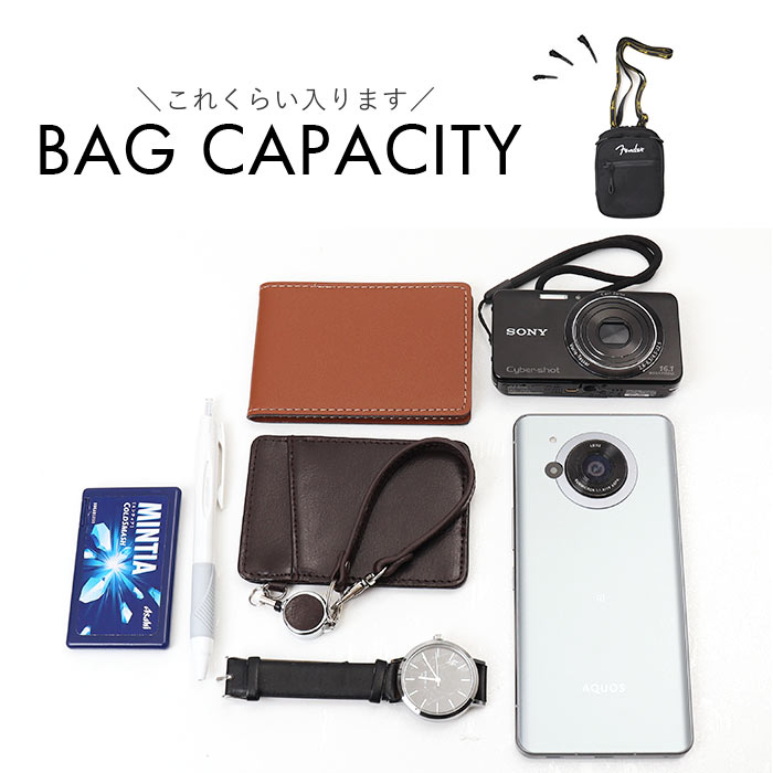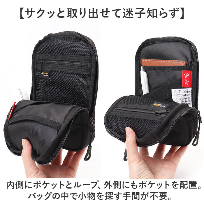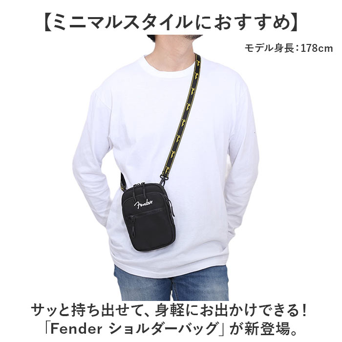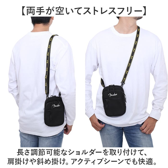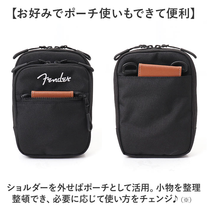 | 商品説明 | 【ミニマルスタイルにおすすめ】サッと持ち出せて、身軽にお出かけできる!「Fender ショルダーバッグ」が新登場。【音楽好き必見Fenderアイテム】シンプルなブラックカラー&ショルダーには、イエローの刺繍で表現されたロゴをON!【持っていればヘビロテ間違いなし】サラッと軽く、強度の高いコーデュラ610デニールポリエステル。色んな場面で活躍◎【両手が空いてストレスフリー】長さ調節可能なショルダーを取り付けて、肩掛けや斜め掛け。アクティブシーンでも快適。【ガバっと開くダブルファスナー】左右どちらからもオープン!出し入れしやすく、ファスナーを閉じれば、セキュリティ面も安心。【A6対応◎最低限の小物をIN】A6サイズが縦向きにすっぽり。スマホや薄手のハンカチなどもすっきり収納。【サクッと取り出せて迷子知らず】内側にポケットとループ、外側にもポケットを配置。バッグの中で小物を探す手間が不要。【お好みでポーチ使いもできて便利】ショルダーを外せばポーチとして活用。小物を整理整頓でき、必要に応じて使い方をチェンジ♪(※)ポーチとしてバッグインし、旅行先でショルダー使用など、お好みで使い分け可能です。【お揃いで使えるユニセックス仕様】性別・年代問わず持ちやすいデザイン&カラー。フロントの刺繍ロゴがワンポイント!【Fender-フェンダー】・1946年、レオ・フェンダーによって創設された世界的楽器製造メーカー。【ポケット仕様】内側:オープンポケット×1、ファスナー式メッシュポケット×1、ゴムループ×3前面:ダブルファスナー式ポケット×1(内側にオープンポケット×1)、ファスナーポケット×1背面:オープンポケット×1 |