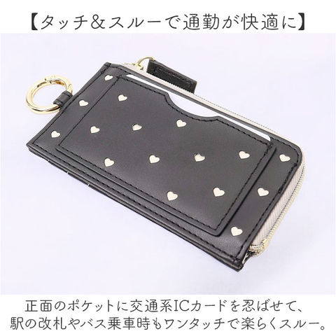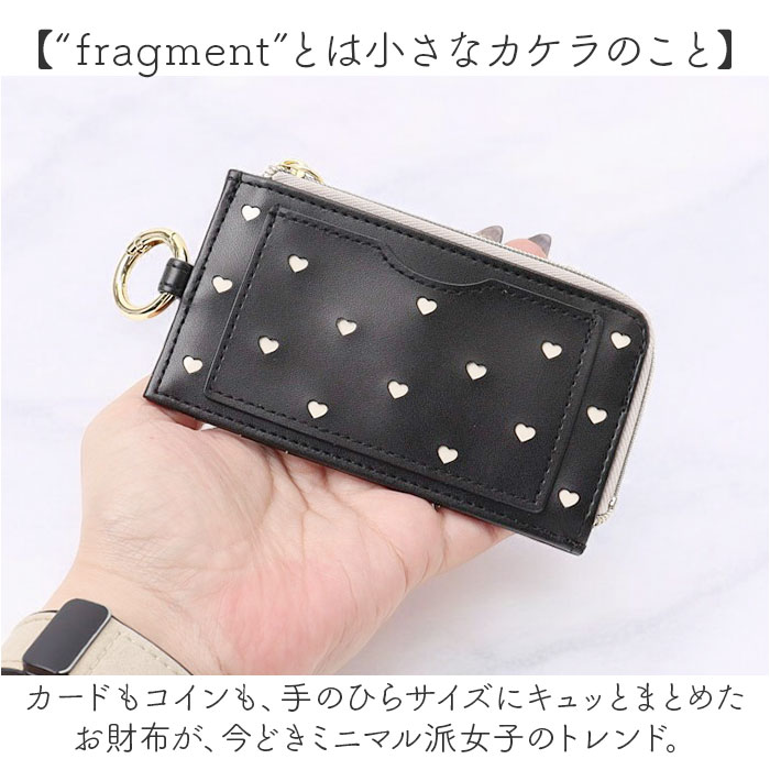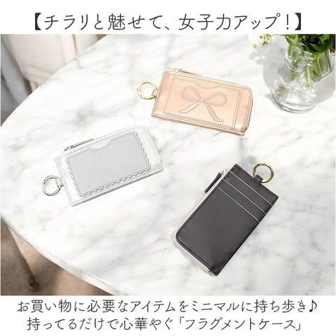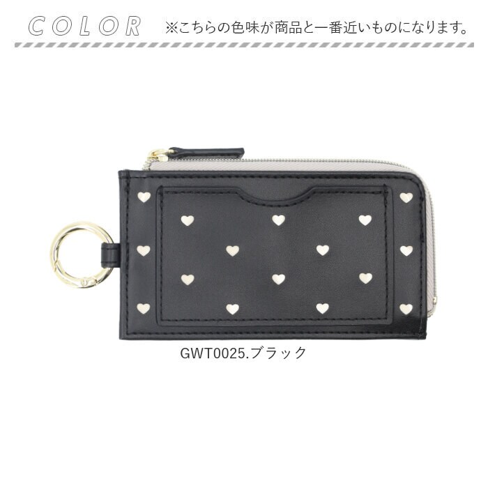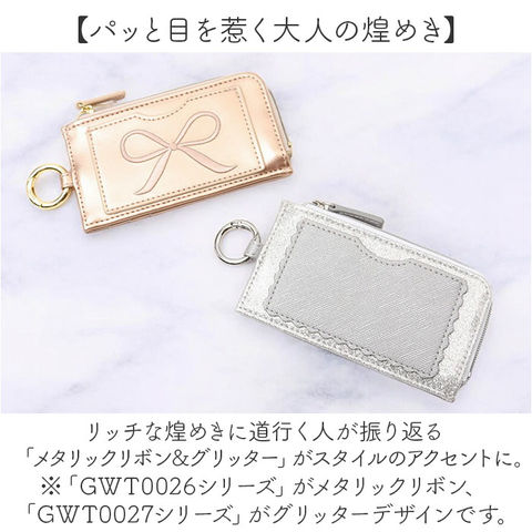 | 商品説明 | 【チラリと魅せて、女子力アップ!】お買い物に必要なアイテムをミニマルに持ち歩き♪持ってるだけで心華やぐ「フラグメントケース」【“fragment”とは小さなカケラのこと】カードもコインも、手のひらサイズにキュッとまとめたお財布が、今どきミニマル派女子のトレンド。【キャッシュレス派の必須アイテム】背面側にクレジットカード用のカードポケットを3つ装備し、キャッシュレスでの支払いがスムーズ。【コインが見やすい優秀スタイル】L字型に大きく開くファスナーポケットは、折りたたんだ紙幣やコインがたっぷり入るササマチ仕様。【タッチ&スルーで通勤が快適に】正面のポケットに交通系ICカードを忍ばせて、駅の改札やバス乗車時もワンタッチで楽らくスルー。【マルチに使えるキーリング】バッグのハンドルに取り付けたり、リール付きキーケース等につないで使えるキーリング付き。【世代を問わずに使える可愛らしさ】いつでも可愛らしいものに囲まれていたい大人女子には型抜きハートを散りばめた「ミニハート」を♪※「GWT0025シリーズ」が型抜きミニハートデザインです。【パッと目を惹く大人の煌めき】リッチな煌めきに道行く人が振り返る「メタリックリボン&グリッター」がスタイルのアクセントに。※「GWT0026シリーズ」がメタリックリボン、「GWT0027シリーズ」がグリッターデザインです。【いつでも身軽でいたい大人女子に】普段使いのパスケースとしてはもちろん、旅行時など身軽に行動したい時のサブウォレットに最適。【ポケット仕様】[正面]カードポケット×1[中央]ファスナーポケット×1[背面]カードポケット×3 |