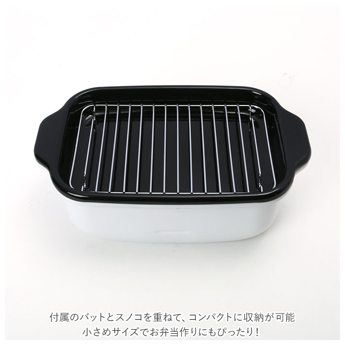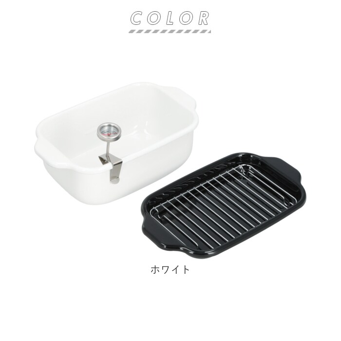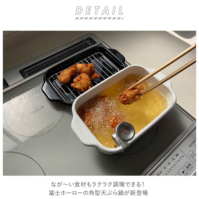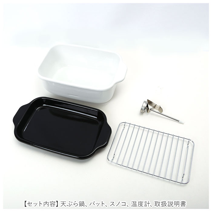 富士ホーロー 角型天ぷら鍋 温度計/バット/スノコ網付き【ホワイト】