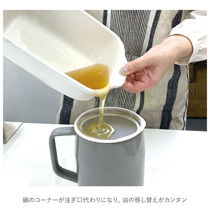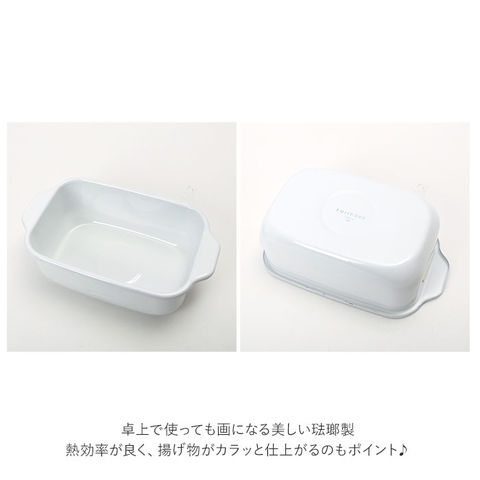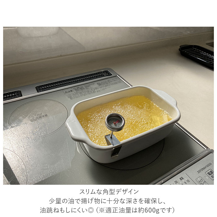 | 商品説明 | なが~い食材もラクラク調理できる!富士ホーローの角型天ぷら鍋が新登場。スリムな角型デザイン。少量の油で揚げ物に十分な深さを確保し、油跳ねもしにくい◎(※適正油量は約600gです。)対応熱源はガスコンロ、IH200V。(※IHの揚げ物モードには非対応。)内側の幅が約20cmあり、エビの天ぷらやアスパラガス、ロースカツなど長めの食材も揚げやすいサイズ感。・220度まで確認可能な、クリップタイプの温度計付き。防水型で丸洗いOKなので、お手入れもラクチン。鍋のコーナーが注ぎ口代わりになり、油の移し替えがカンタン。卓上で使っても画になる美しい琺瑯製。熱効率が良く、揚げ物がカラッと仕上がるのもポイント♪滑らかな表面は、油汚れもすっきり洗い落とせるのが嬉しい。温度計以外は食洗機対応◎付属のバットとスノコを重ねて、コンパクトに収納が可能。小さめサイズでお弁当作りにもぴったり!・【セット内容】天ぷら鍋、バット、スノコ網、温度計、取扱説明書 |