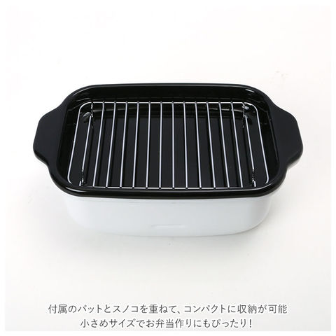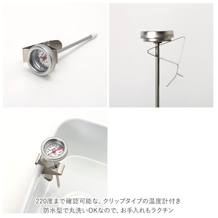 | 素材 | [鍋]スチール(フッ素樹脂加工) [スノコ]鉄クロムメッキ塗装 ※[付属品]バット、スノコ網、温度計、取扱説明書 |