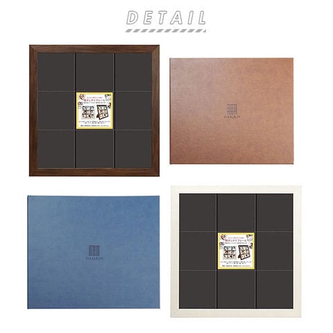 | 素材 | ・ましかくフレーム [フレーム]樹脂 [面材]樹脂 [台紙]PP(ポリプロピレン) ※壁掛け金具・縦横兼用スタンド付き。 ※[付属品]ましかく黒ポケット台紙1枚(透明樹脂板入り)・吊ひも ・ましかく414アルバム [表紙]合成皮革 [黒ポケット台紙]PP(ポリプロピレン) ※黒ポケット台紙は、23シート入りです。 ※[付属品]カットプレート1枚、タイトルカード1枚 |