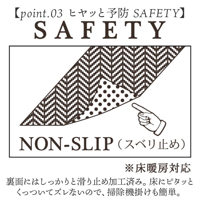 | 商品説明 | 【へリンボン柄で素敵なキッチン空間】繊細なへリンボン柄で、落ち着いたキッチン空間を演出!FLAFIT キッチンマット へリンボンIV」【まるでオーダーメイドの生地感】仕立屋のオーダーメイドスーツの生地をイメージした、味わい深いへリンボン柄が床にフィット!【シンプルで快適!4つのポイント】お洒落な生地感だけじゃない♪毎日キッチンに立つママさんに嬉しい「4つの工夫」をマットに凝縮!【point.01 床ピタFLAT】キッチンの引き出しに干渉しない、床にピタッとフラットな厚みを追及!つまづきにくく安全性も◎【point.02 くるっと柔らかFIT】薄手で柔らかく、くるくると丸めて洗濯ネットに入れれば、丸洗いOK!日常のお手入れがらくらく。【point.03 ヒヤッと予防 SAFETY】裏面にはしっかりと滑り止め加工済み。床にピタッとくっついてズレないので、掃除機掛けも簡単。【point.04 日々の暮らしをCLEANに】お掃除や洗濯がしやすいのに加え、抗菌防臭加工を施しいつでも清潔!品質にこだわった日本製品。【床暖房にも、もちろん対応】耐熱温度に配慮した素材で底面加工し、床暖房にも対応。キッチンだけでなくリビングにもお勧め。【ミニキッチンにぴったりサイズ】ワンルームのミニキッチンでも使いやすい50×120cmサイズで、シンク前スペースをピタッとカバー。【へリンボンって何?】ニシンの骨に似ていることから名づけられたへリンボン。織り地のような温かみのある表情が魅力。【インテリアに馴染む大人カラー】フローリングの床やお洒落な家具と相性がよく、主張し過ぎずお部屋に馴染むカラーラインナップ。※マット右下の織りネームの生地色は、カラーにより異なります。【エコな包装パッケージ】クラフト紙でクルっと巻いて、リボンで留めたシンプルな簡易包装パッケージで贈り物にも最適。 |