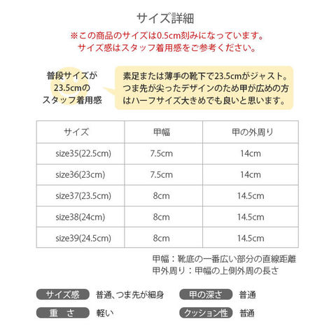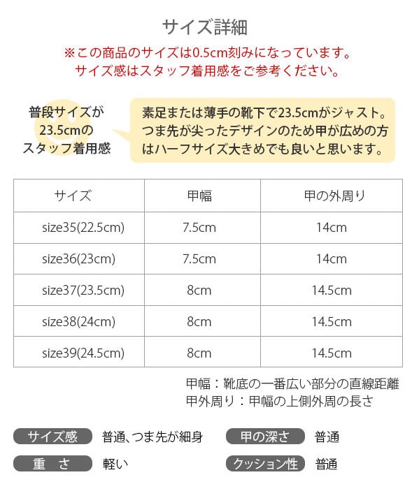 | サイズ | 22.5cmサイズ 23cmサイズ 23.5cmサイズ 24cmサイズ 24.5cmサイズ ※ヒール高約1cm |