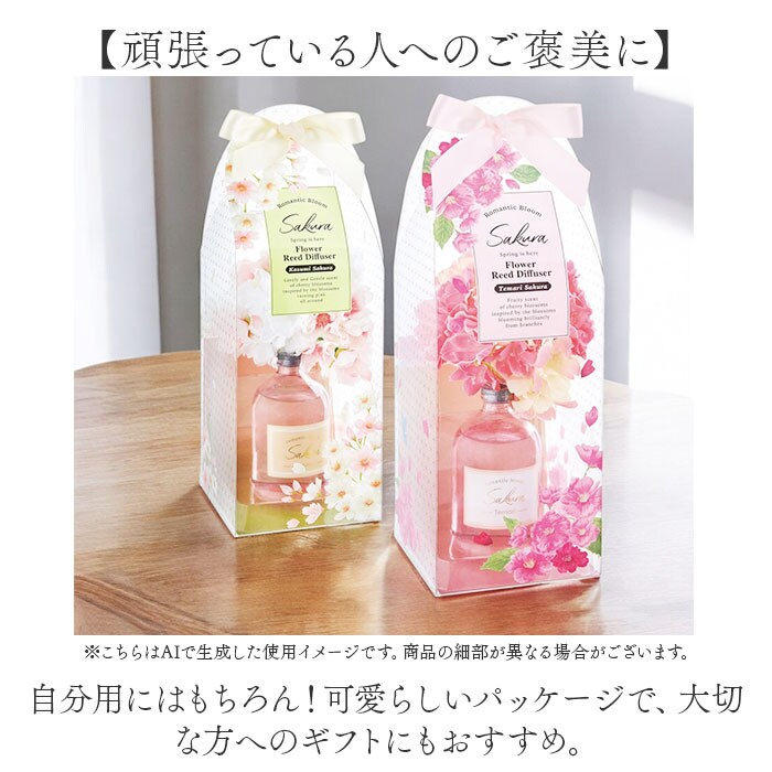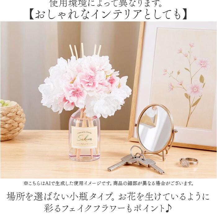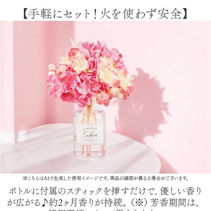 | 商品説明 | 【香りとともに空間にアクセントを】ボリュームのある桜が華やかに花咲いて、ふんわり香る♪サクラフラワーリードディフューザー。【手軽にセット!火を使わず安全】ボトルに付属のスティックを挿すだけで、優しい香りが広がる♪約2ヶ月香りが持続。(※)芳香期間は、使用環境によって異なります。【おしゃれなインテリアとしても】場所を選ばない小瓶タイプ。お花を生けているように彩るフェイクフラワーもポイント♪【毎日の生活にお気に入りの香りを】淡く愛らしく降りしきるカスミ桜をイメージした、可憐でやさしい桜の香り。【頑張っている人へのご褒美に】自分用にはもちろん!可愛らしいパッケージで、大切な方へのギフトにもおすすめ。 |