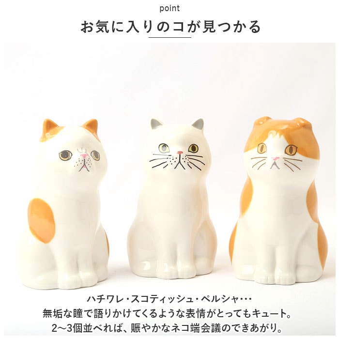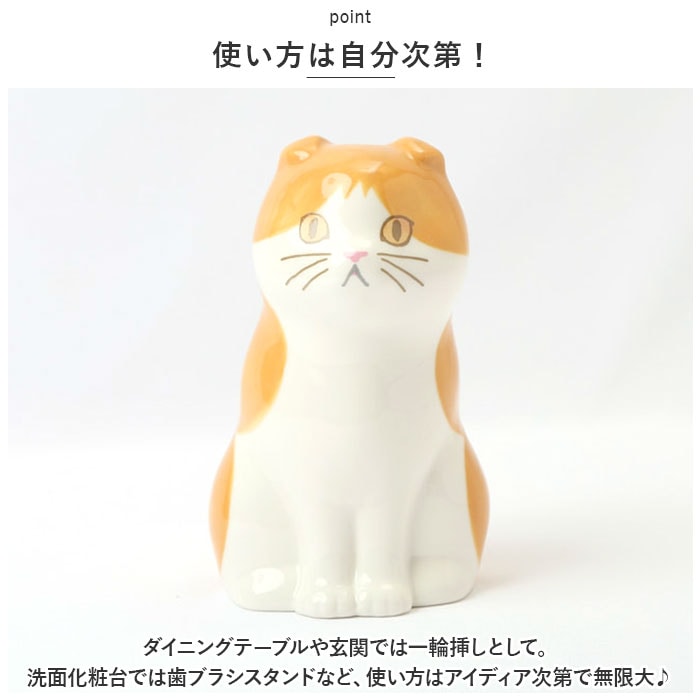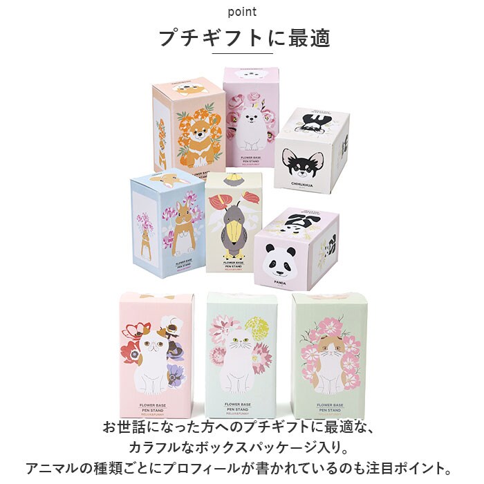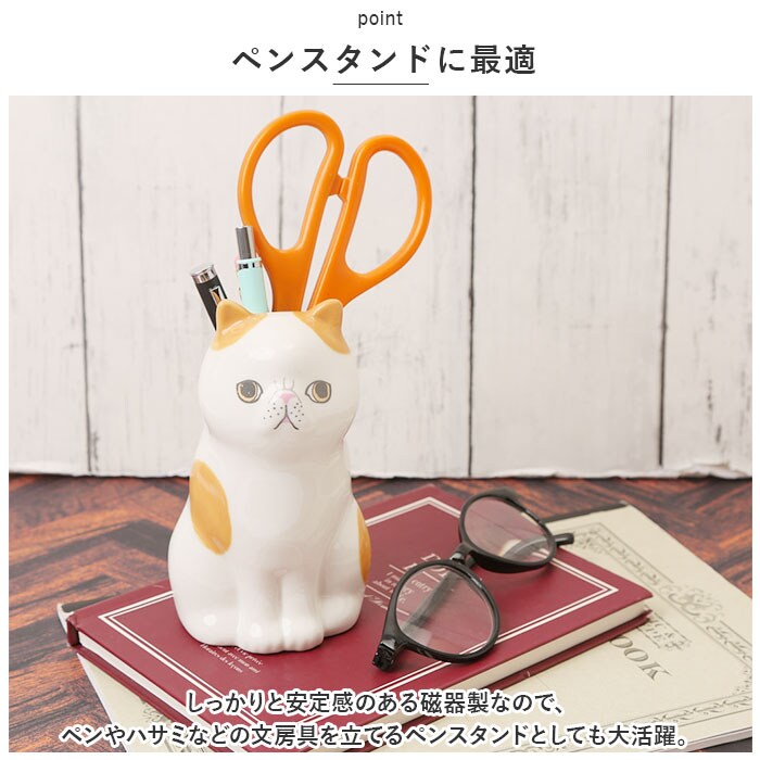| 商品説明 | ちょこんと佇むネコちゃんの姿に、ほっこり癒される♪かわいいネコのフラワー&ペンスタンド。【一輪の花でお部屋が華やぐ】花屋で買い求めたミニブーケや、お庭で摘んだ一輪の花をさりげなく飾るのにちょうどいい磁器製のフラワースタンド。【ペンスタンドに最適】しっかりと安定感のある陶器製なので、ペンやハサミなどの文房具を立てるペンスタンドとしても大活躍。【使い方は自分次第!】ダイニングテーブルや玄関では一輪挿しとして。洗面化粧台では歯ブラシスタンドなど、使い方はアイディア次第で無限大♪【お手入れもとっても簡単】磁器の表面を釉薬で滑らかに仕上げてあるので、お花を飾った後に汚れが気になったら、サッと水洗いでお手入れ簡単。【お気に入りのコが見つかる】ハチワレ・スコティッシュ・ペルシャ・・・無垢な瞳で語りかけてくるような表情がとってもキュート。2~3個並べれば、賑やかなネコ端会議のできあがり。【プチギフトに最適】お世話になった方へのプチギフトに最適な、カラフルなボックスパッケージ入り。ネコちゃんの種類ごとにプロフィールが書かれているのも注目ポイント。 |