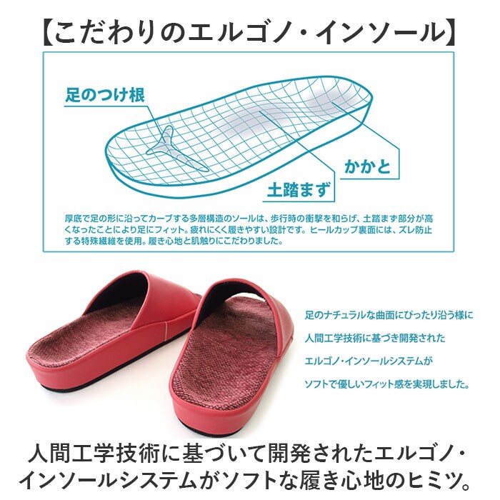 | 商品説明 | 【一度履いたら手放せない快適さ】足裏のナチュラルな曲面にぴったり寄り沿う♪「フット快カラー スリッパ」が新登場!【心地よさを追求するスリッパ】・「フット快カラー」は、足の形状や歩行のメカニズムを追求した画期的な快適スリッパ。【こだわりのエルゴノ・インソール】人間工学技術に基づいて開発されたエルゴノ・インソールシステムがソフトな履き心地のヒミツ。【足裏に優しい多層構造ソール】厚底で足の形に沿ってカーブする多層構造のソールが歩行時の衝撃を拡散・吸収し、足裏に優しい。【疲れにくくて、履きやすい】踵を覆うカップイン構造と土踏まずを高くすることでフィット感が向上。長時間履いても疲れにくい。【素足のままでもサラリと快適】足の甲の内側は滑らかな起毛生地で仕上げ、素足で履いても、サラリと気持ちのよい肌触り。【かかとがズレない小さな工夫】ヒールカップ裏面にかかとのズレを防止する特殊繊維を使用。かかとが安定し、快適な歩きやすさ。【滑りにくいアウトソール】厚さ5mmのしっかりとした底材が、フローリングや階段など滑りやすい床面をしっかりグリップ。【サッとひと拭きで簡単キレイ】足の甲のベルトやソール周りにはフェイクレザーを使用。汚れたらサッと拭いて、清潔さをキープ。【ご家族でリンクコーデも◎】カップルやファミリーでお揃いにできる22cm~26.5cmまでの幅広いサイズ展開も魅力のひとつ。※サイズ表記は、「22~22.5cm」から「26~26.5cm」までの適応サイズで記載しております。【安心のMade in Japan製品】江戸時代から草履製造が盛んな奈良県にて、ひとつひとつ手作りされている安心の日本製品。【おうち時間に溶け込むカラー】気取らない普段のスタイルのアクセントになる、華やかなビビッドカラーを中心にラインナップ。 |
