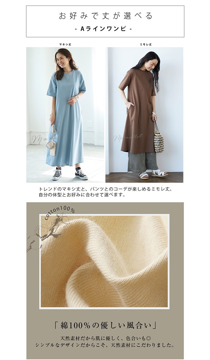 | 商品説明 | 丈が選べる!コットン100%のAラインワンピース自分の身長や着たいスタイルに合わせて、2つの丈を用意しました!!トレンドのマキシ丈は、これ1枚でコーディネートが完成。ミモレ丈は、お手持ちのパンツやレギンスと合わせて、コーディネートが楽しめます。裾にかけてまっすぐ広がる、Aラインワンピース。両脇ポケット付きで、プラッとコンビニに行っても問題無し。お出かけにも、コンビニにも行ける、使いやすいワンピースです! |