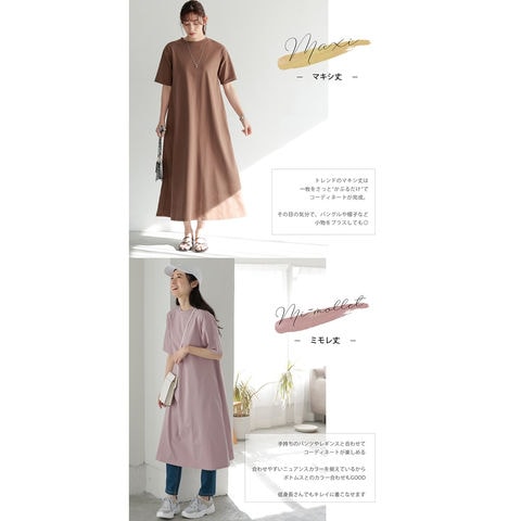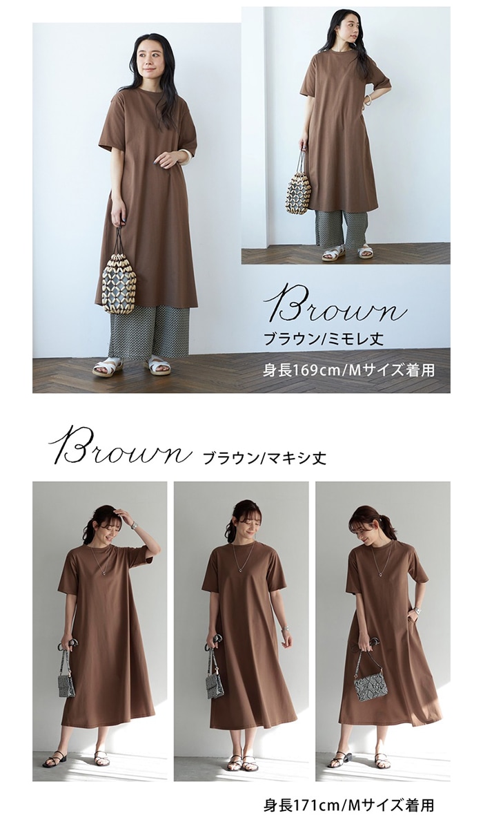 丈が選べる!綿100%Aラインカットソーワンピース【ブラウン】【マキシ/Mサイズ】