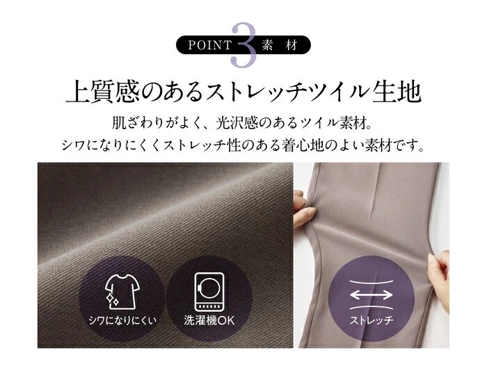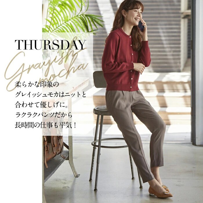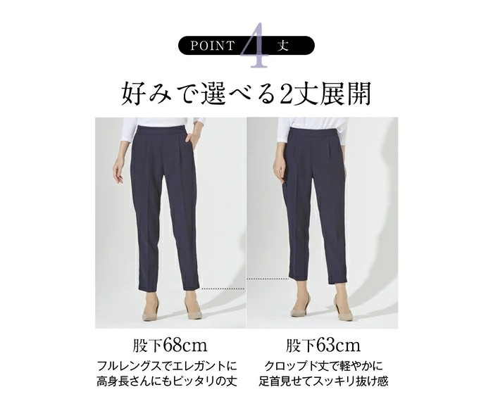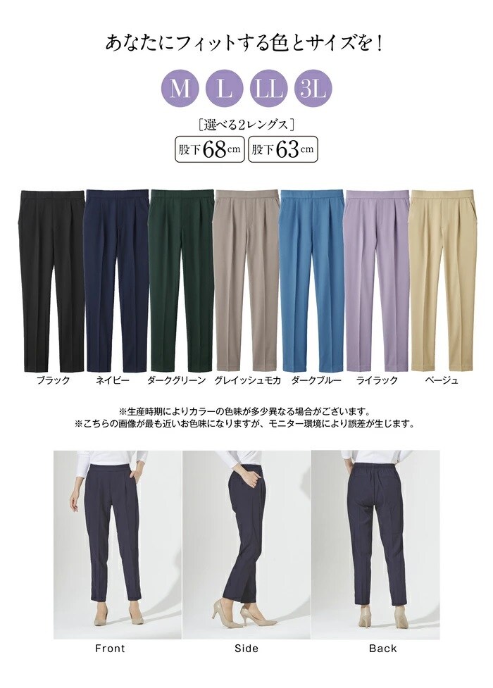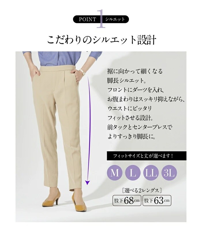 | 商品説明 | 美脚もラクも両方欲張るアイテムPOINT(1)こだわりのシルエット設計POINT(2)ヒップラインをきれいに見せながらゆとりある設計POINT(3)上質感のあるストレッチツイル生地POINT(4)好みで選べる2丈展開POINT(5)毎日使えるマルチパンツ |