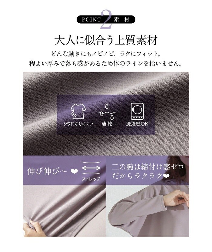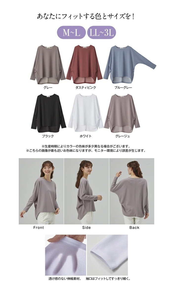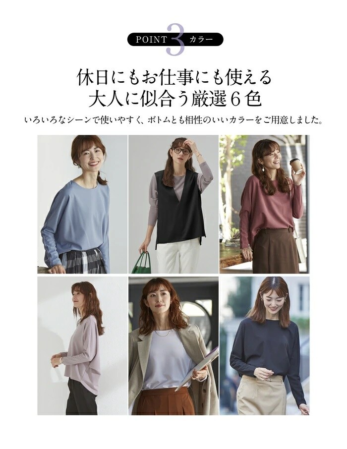 | 商品説明 | 気になる部分は隠して着痩せ細身に見えるのはもちろん、シルエットも自慢。テクニック不要で女性らしいラインが誕生。着るだけで華奢見せ。なのにゆとりはキープ。大人に似合う上質素材どんな動きにもノビノビ、ラクにフィット。程よい厚みで落ち感があるため体のラインを拾いません。休日にもお仕事にも使える大人に似合う厳選6色いろいろなシーンで使いやすく、ボトムとも相性のいいカラーをご用意しました。 |