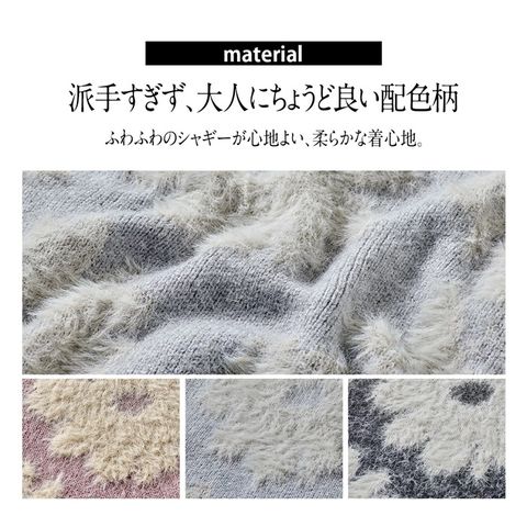| 商品説明 | 甘すぎず、派手過ぎず。この冬はシャドウフラワー着るだけで華やか品よく着映えシャドウフラワー柄が上品に気映える、大人の艶ニットふわふわシャギーが柔らかで心地よい着心地。派手すぎず、大人にちょうど良い配色柄 |