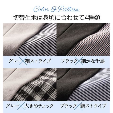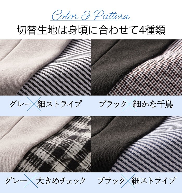 | 素材 | ストライプ布帛/本体:ポリエステル75%・綿25%/別布:ポリエステル75%・綿25% 千鳥柄布帛・チェック柄布帛/本体:ポリエステル75%・綿25%/別布:綿100% |