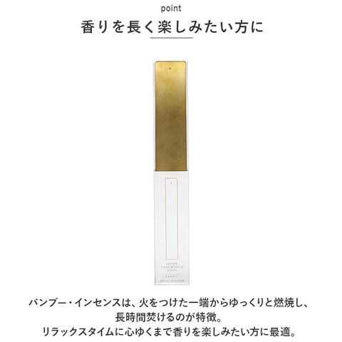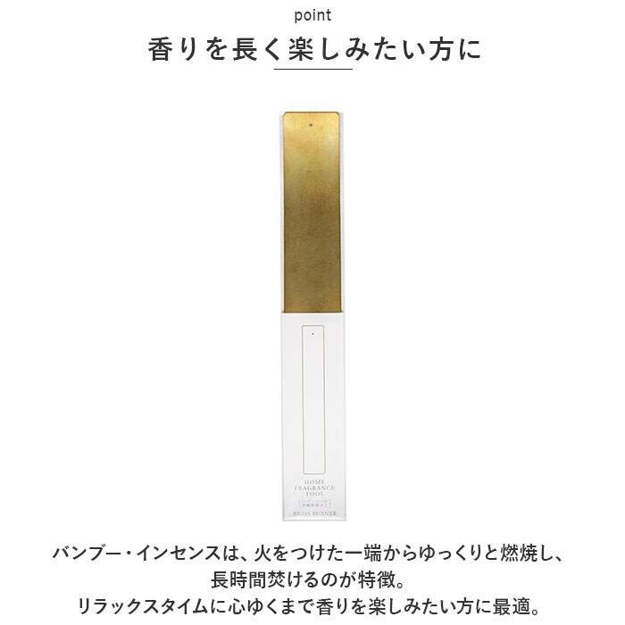 商品説明ほのかに香るバンブー・インセンスで、素敵なおうち時間を。「HOME FRAGRANCE TOOL」から、真鍮製インセンスホルダー(お香立て)が新登場。【曲線が魅せる、シンプルデザイン】スティック型のバンブー・インセンス(竹線香)が手軽に楽しめる!美しい曲線が印象的なシンプルデザイン。【香りを長く楽しみたい方に】バンブー・インセンスは、火をつけた一端からゆっくりと燃焼し、長時間焚けるのが特徴。リラックスタイムに心ゆくまで香りを楽しみたい方に最適。【お香のセットが簡単】真鍮プレート片側が、ゆったりと頭をもたげたユニークなカタチ。先端の小さな穴にインセンスの根本を差し込んで火を灯せば、いつでもすぐにアロマタイム。【アロマタイム後もすっきり快適】バンブー・インセンスの灰は、短冊状の真鍮プレートの上に落ちるので、テーブルやキャビネットの天板を汚す心配がなく、片付けも手間いらず。【アンティーク感のある素材使い】使い込むほどに深みを増す色合いと、味わい深くくすんでいく真鍮ならではの表情の変化が楽しめるのも魅力のひとつ。【香りとあなたをつなぐデザイン】・「HOME FRAGRANCE TOOL」は、お部屋の雰囲気に優しく馴染む、香りとあなたをつなぐアロマグッズシリーズ。