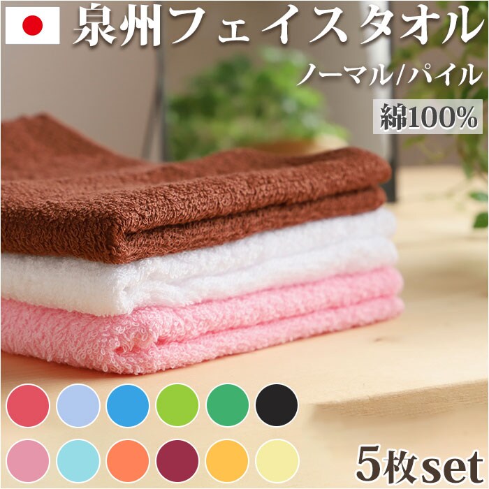 | 商品説明 | 使い勝手抜群!「泉州タオル カラーフェイスタオル」5枚セットが新登場。優しい肌触りの綿100%素材!後晒製法により”綿”本来の優れた吸水性を発揮する、日本製の泉州タオル。後晒の工程で糸に付いている糊や蝋分を洗い流しているから、清潔で安心◎ノーマル(平地付き)とパイルの2タイプ。(※タイプによりカラーバリエーションが異なります。)洗い替えや用途によって使い分けできる5枚セット。ご自宅の洗面やキッチン、お風呂などではもちろん、業務用としても活躍。薄手でかさばらないので、旅行時などの持ち運びにも最適! |