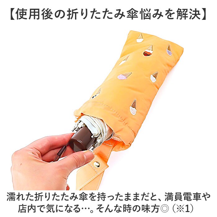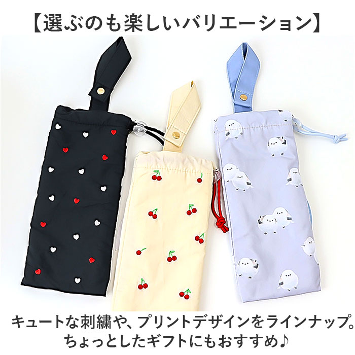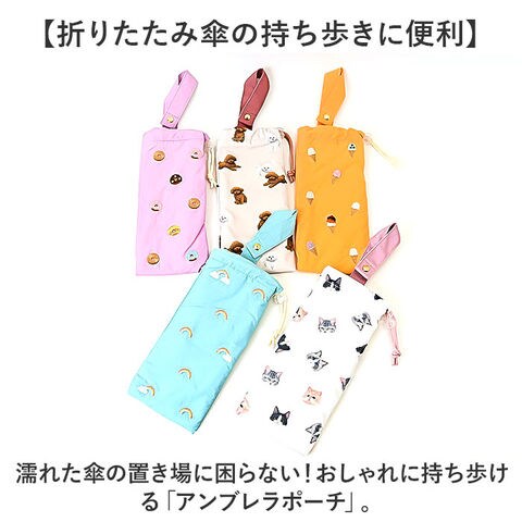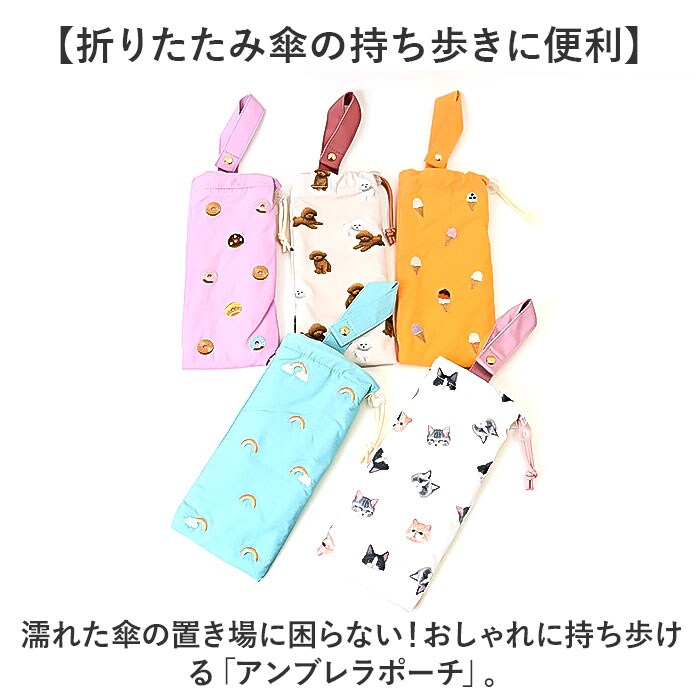 | 商品説明 | 【折りたたみ傘の持ち歩きに便利】濡れた傘の置き場に困らない!おしゃれに持ち歩ける「アンブレラポーチ」。【使用後の折りたたみ傘悩みを解決】濡れた折りたたみ傘を持ったままだと、満員電車や店内で気になる…。そんな時の味方◎(※1)適応サイズ:全長約215mm(ハンドル含まない)/周囲約180mm。デザインによっては収納できない場合もございます。【キュッと絞れる巾着タイプ】開口部の紐を絞って開閉がスムーズ。中身の飛び出しもガード。【水濡れから守る表地&裏地】表地に撥水加工を施し、裏地は吸水力に優れたマイクロファイバー。バッグや洋服濡れを防止。(※2)防水仕様ではありません。【使わない時はコンパクトに収納】エコバッグのように丸め、ストラップで留めればすっきり。保管に困らないのも嬉しいポイント。【バッグハンドルに取り付けも自在】ストラップを使って、バッグのハンドルなどに取り付けも可能。急な雨でもサッと取り出せる!【選ぶのも楽しいバリエーション】キュートな刺繍や、プリントデザインをラインナップ。ちょっとしたギフトにもおすすめ♪ |