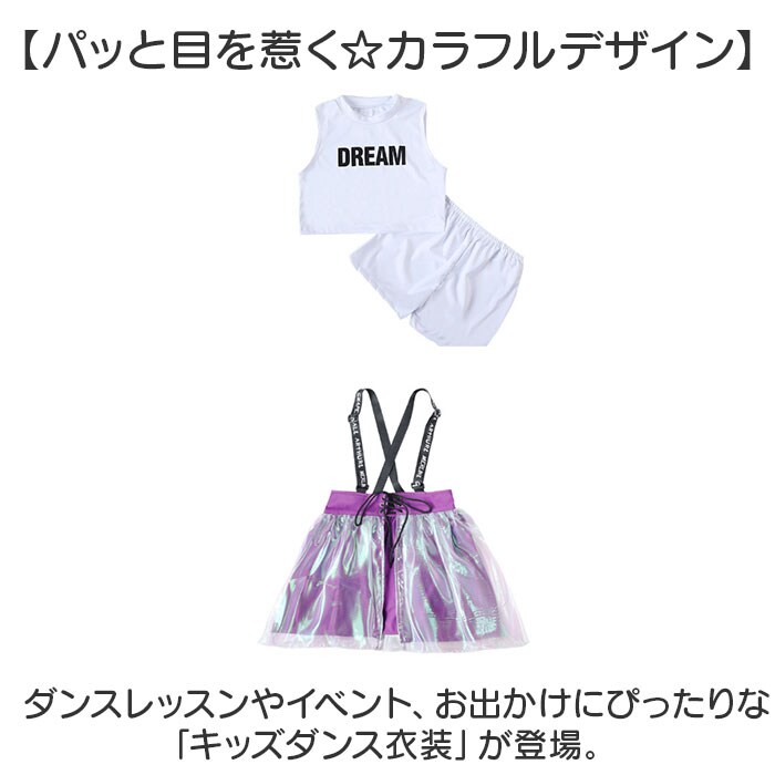| 商品説明 | 【パッと目を惹く☆カラフルデザイン】ダンスレッスンやイベント、お出かけにぴったりな「キッズダンス衣装」が登場。【キュートなデザインがたまらない!】透け感のあるオーロラカラーの生地をふんわり重ねたスカートがかわいいカラフルなセット☆【スカートはサイズ調節OK】ウエストの紐とサスペンダーでサイズ調節OK!【コーデに迷わない!3点セット】トップス、パンツ、スカートの3点セット☆これを着るだけで全身キマる!【動きやすく機能性も◎】程よく伸縮性があり、体にフィットしするのでダンスの動きを邪魔せずストレスフリー。【選べるカラー&サイズ】幅広いサイズが揃っているので、チームや姉妹でお揃いにしてもかわいい! |