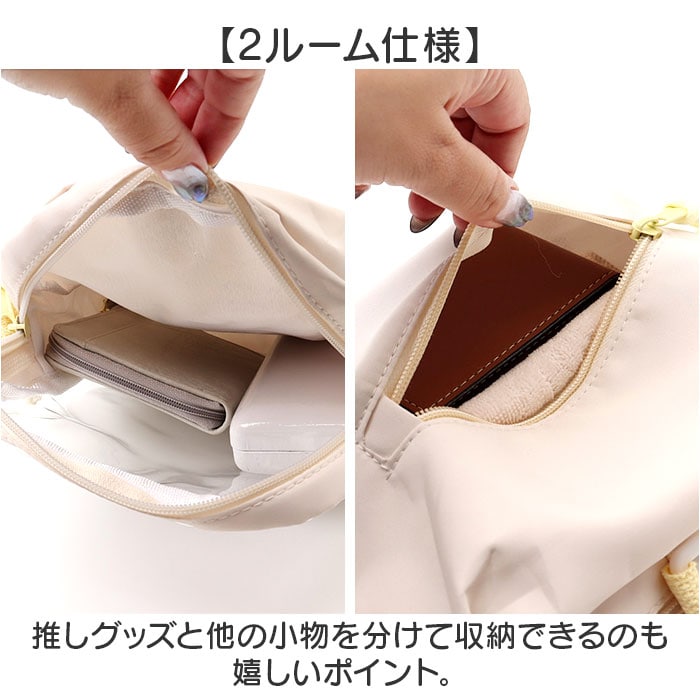 | 商品説明 | 【推し活にピッタリな痛バッグ】推し活にぴったりなクリア窓付き「痛バッグ ショルダー」が登場。【ぬいぐるみを入れるのに最適】クリア窓のポケットはマチ幅があり、厚みのあるぬいぐるみも収納しやすい◎【2ルーム仕様】推しグッズと他の小物を分けて収納できるのも嬉しいポイント。【トレンドの見せる収納に】推し活以外にもポーチやイヤホンなどを入れて見せる収納として使うのもオススメ♪【背面はシンプルで普段使いも】くるっと窓を後にすれば普段使いもできる普通のバッグに◎【引手がオシャレなアクセントに】ファスナーの引手は存在感もある編み込みの作り。握りやすい大きめのデザイン。【肩掛けも斜めがけもOK!】長さ調節ができるストラップなので肩掛けも斜めがけもOK!ハンズフリーで動ける◎【ポケット仕様】背面・・・ファスナーポケット×1 |