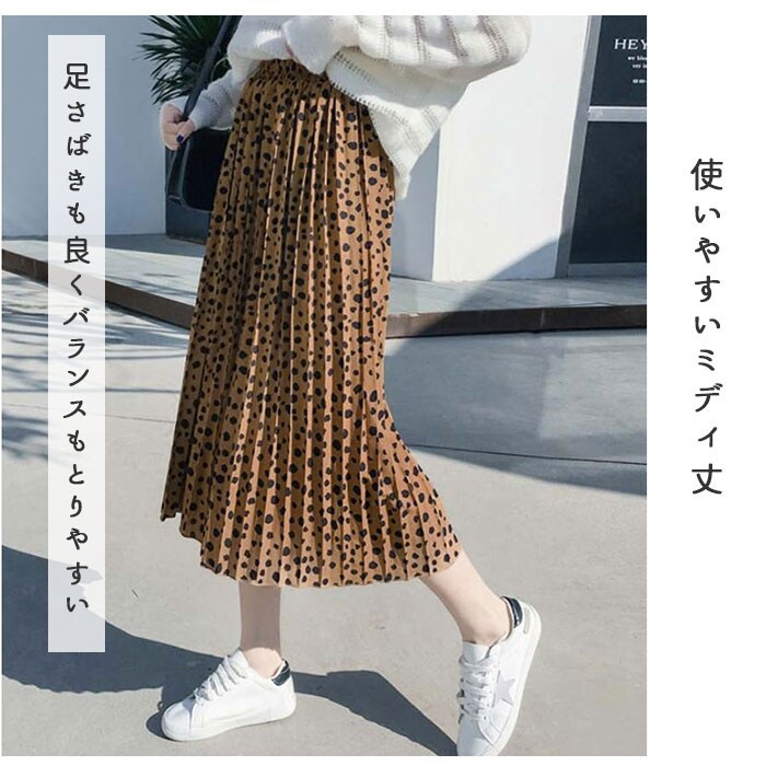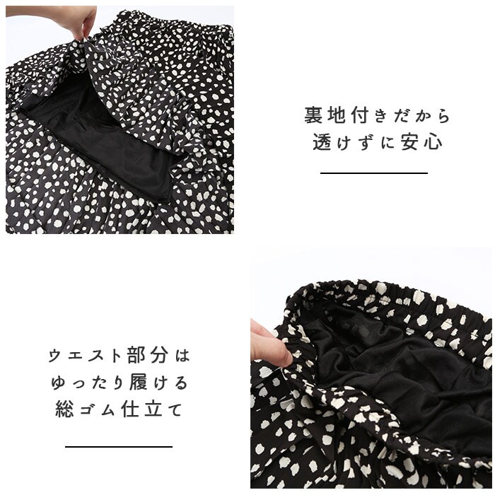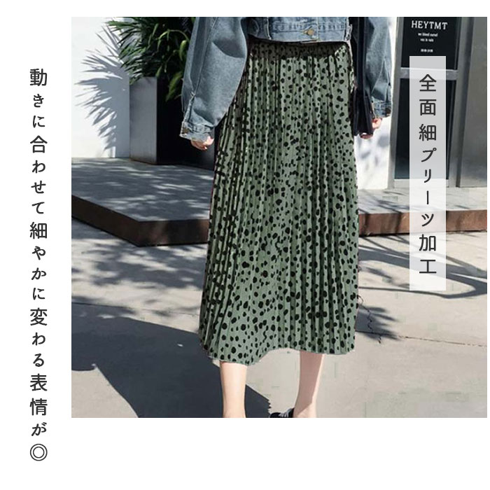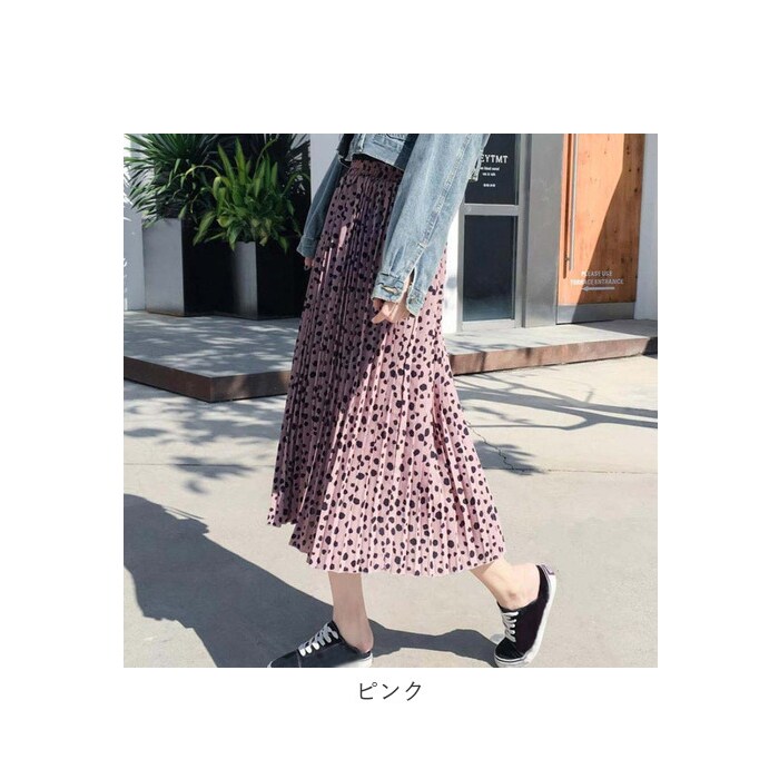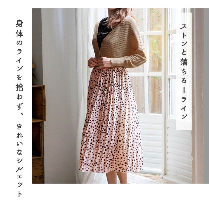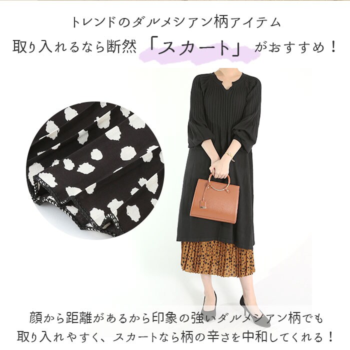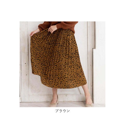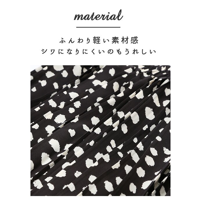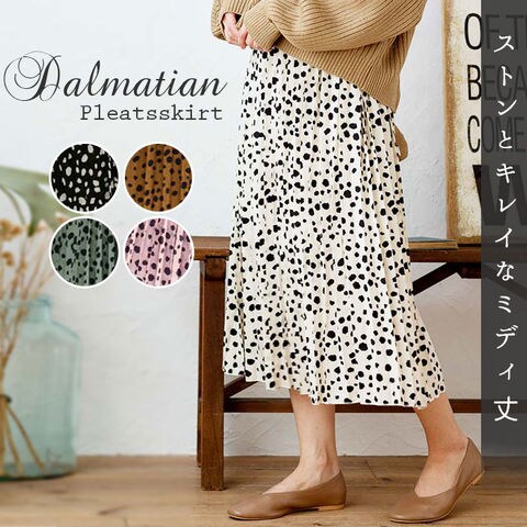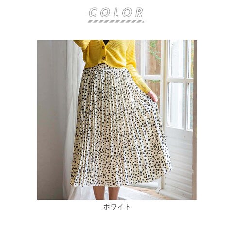 | 商品説明 | 全面細プリーツ加工の、軽やかエアリースカートが登場!ダルメシアン柄の可愛さは残しながらも、キレイめに仕上げたデザイン。ドットよりもカジュアル感は控えめだから、大人女子にだってぴったり♪スニーカーやヒールにもマッチする着回し力も嬉しいポイント。ウエスト部分はゆったり履ける総ゴム仕立て。ふんわり軽い素材感を生かしながらも、裏地付きだから透けずに安心。一枚でストンと気軽に履けちゃう♪風に揺れる裾が優しいムード。お気に入りのカラーを選んで。 |