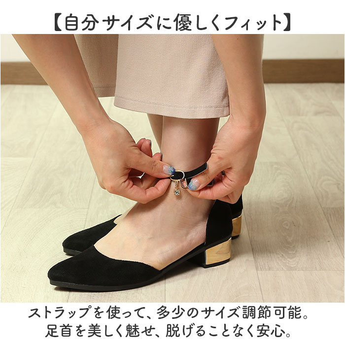 | 商品説明 | 【オン・オフ問わずヘビロテ♪】キレイめスタイルにマッチ。おしゃれな足元を演出する「ストラップ付きパンプス」が新登場。【エレガントにキマる大人な1足】しっとり柔らかな素材で、落ち着きのある仕上がりに。ストラップ部分にはチャームをプラス。【軽やかな履き心地でストレスフリー】見た目はシューズだけど、サンダルに近いサイドオープンタイプ。足入れもスムーズ。【すっきり見せるポインテッドトゥ】つま先が細く尖ったデザイン。ヒールの高さに関係なく、スタイリッシュな印象に。【自分サイズに優しくフィット】ストラップを使って、多少のサイズ調節可能。足首を美しく魅せ、脱げることなく安心。【安定感のあるちょこっとヒール】足が疲れにくいローヒール。少しの幅を持たせることで、安定した歩行をサポート。【お気に入りを選べるカラー】ベーシックやアクセントになるカラー。お好みで選んで、お出かけの相棒に☆ |