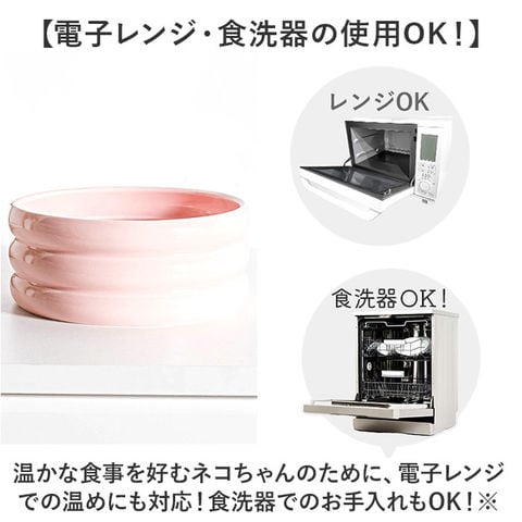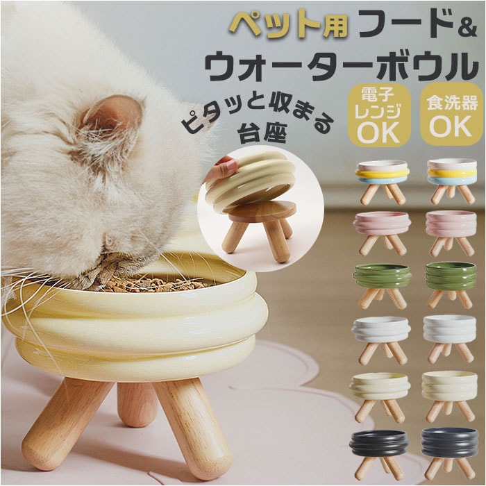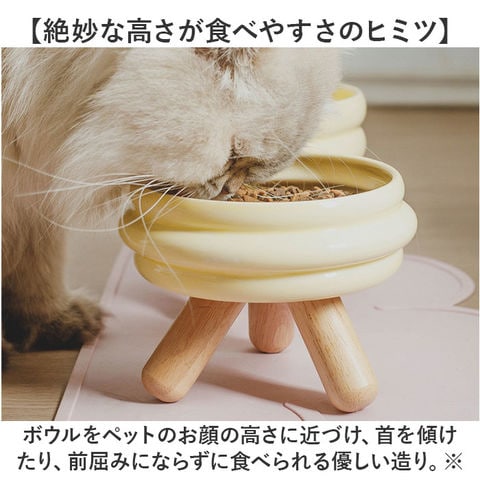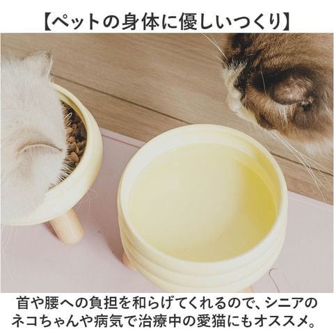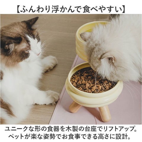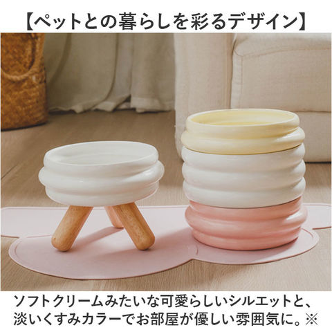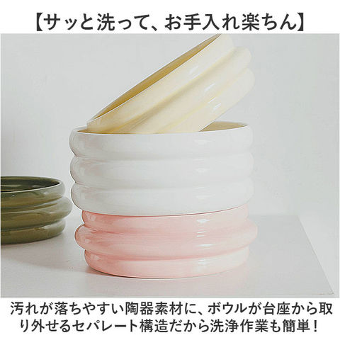 | 商品説明 | 【ペットに優しい、思いやり設計】ネコちゃんワンちゃんが快適にお食事できる「ペット用 フード&ウォーターボウル」が新登場!【ふんわり浮かんで食べやすい】ユニークな形の食器を木製の台座でリフトアップ。ペットが楽な姿勢でお食事できる高さに設計。【絶妙な高さが食べやすさのヒミツ】ボウルをペットのお顔の高さに近づけ、首を傾けたり、前屈みにならずに食べられる優しい造り。※フードボウル・ウォーターボウルともに高さ約11.5cm程度(木製台座にボウルを乗せた時のボウルのフチの高さ)【ペットの身体に優しいつくり】首や腰への負担を和らげてくれるので、シニアのネコちゃんや病気で治療中の愛猫にもオススメ。【たっぷり入ってこぼれにくい】ボウル内側はフードやお水がこぼれにくい程よい深さ!食べこぼし汚れの片付け手間もグッと楽に。※フードボウルとウォーターボウルで深さが異なります。【安定感のあるセラミック(陶器)製】どっしりと重みのある陶器製のボウル底面に、台座がピタッと収まる構造なので、安定感も抜群。【サッと洗って、お手入れ楽ちん】汚れが落ちやすい陶器素材に、ボウルが台座から取り外せるセパレート構造だから洗浄作業も簡単!【電子レンジ・食洗器の使用OK!】温かな食事を好むネコちゃんのために、電子レンジでの温めにも対応!食洗器でのお手入れもOK!※電子レンジでの温めの際は、温めすぎにご注意ください。猫は人肌程度に温めたフードを好む傾向があります。【ペットとの暮らしを彩るデザイン】ソフトクリームみたいな可愛らしいシルエットと、淡いくすみカラーでお部屋が優しい雰囲気に。※一部ブラックなどベーシックカラーの商品もございます。 |