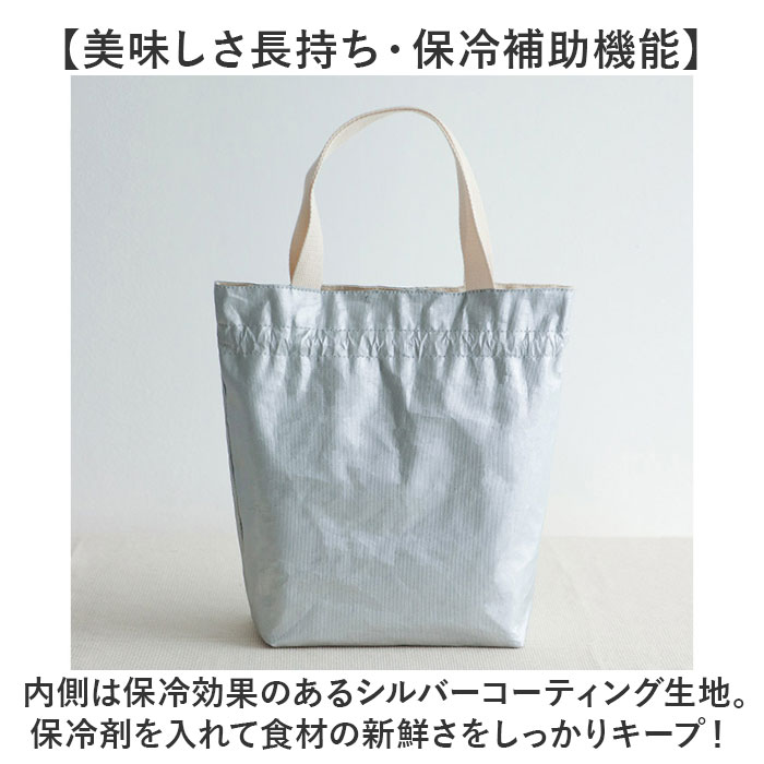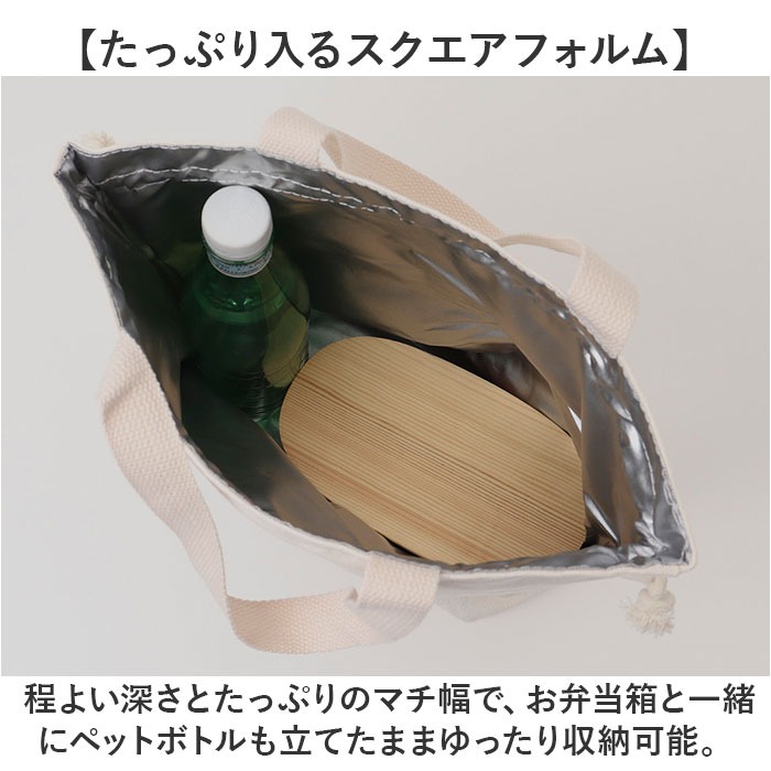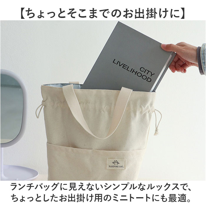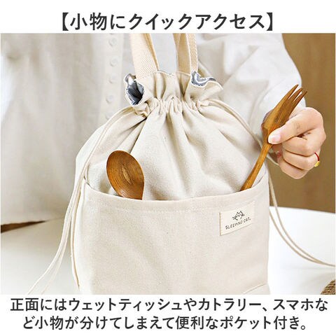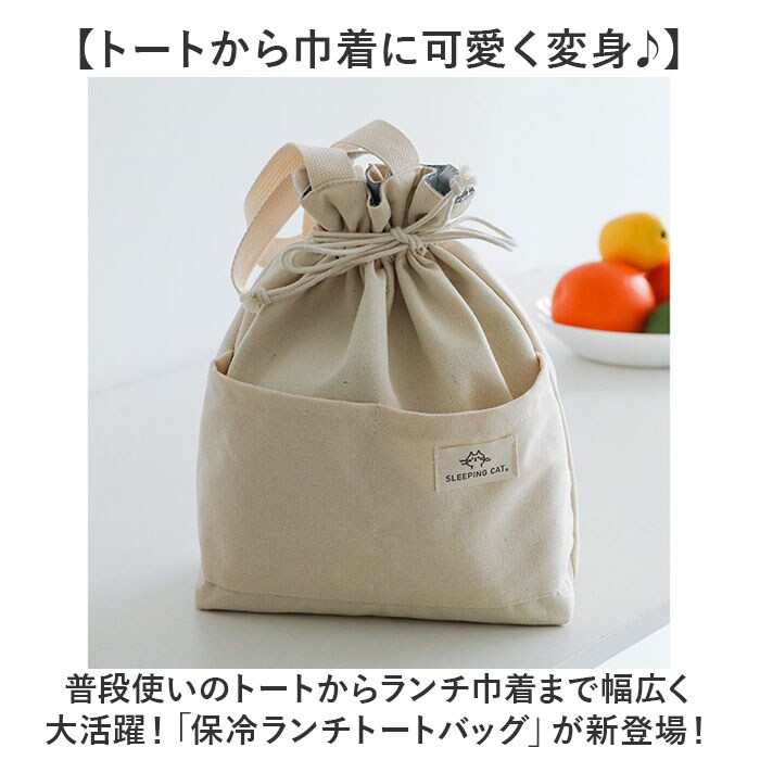 | 商品説明 | 【トートから巾着に可愛く変身♪】普段使いのトートからランチ巾着まで幅広く大活躍!「保冷ランチトートバッグ」が新登場!【キャンバス生地の優しい風合い】淡いアイボリーのコットンキャンバスの素朴な風合いが、気取らないいつものスタイルにマッチ♪【たっぷり入るスクエアフォルム】程よい深さとたっぷりのマチ幅で、お弁当箱と一緒にペットボトルも立てたままゆったり収納可能。【美味しさ長持ち・保冷補助機能】内側は保冷効果のあるシルバーコーティング生地。保冷剤を入れて食材の新鮮さをしっかりキープ!【サッとひと拭きで簡単キレイ】内側のコーティング生地ははっ水性にも優れており、汚れや水滴がサッと拭き取れてお手入れ簡単!【キュッと絞って巾着にもなる♪】バッグの口はキュッと絞れる巾着仕様。小物が飛び出す心配がなく、バッグ内側の目隠し効果も◎【小物にクイックアクセス】正面にはウェットティッシュやカトラリー、スマホなど小物が分けてしまえて便利なポケット付き。【ちょっとそこまでのお出掛けに】ランチバッグに見えないシンプルなルックスで、ちょっとしたお出掛け用のミニトートにも最適。【さりげないワンポイント織ネーム】右側ポケットに縫い付けた、縮れたおヒゲが可愛い「SLEEPING CAT」の織ネームがワンポイント。 |