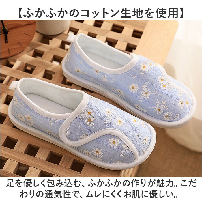 | 商品説明 | 【柔らかな履き心地で高機能◎】滑りにくいアウトソールで安心の「介護シューズ ルームシューズ かかと付き」が登場。【パカパカせずに歩きやすい◎】パカパカしたり脱げたりしにくい、かかと付き。足にしっかりフィットするから歩行が安定。【ふかふかのコットン生地を使用】足を優しく包み込む、ふかふかの作りが魅力。こだわりの通気性で、ムレにくくお肌に優しい。【フローリングも安心の滑り止め】滑り止めを加工した足裏は、1cmとしっかり厚めの仕様。滑りにくいから、歩きが不安な方にも◎【ナチュラルなフラワーデザイン♪】見るたびにハッピーになる、フラワーデザイン。コットンのナチュラルな風合いが大人にマッチ【面ファスナーでフィット感up】足の甲には面ファスナーベルトをON。キュッと締めてフィット感を調節できる!【お仕事やイベントにもオススメ】小回りがきくので、介護や看護職などのお仕事や、授業参観などのイベントでも大活躍! |