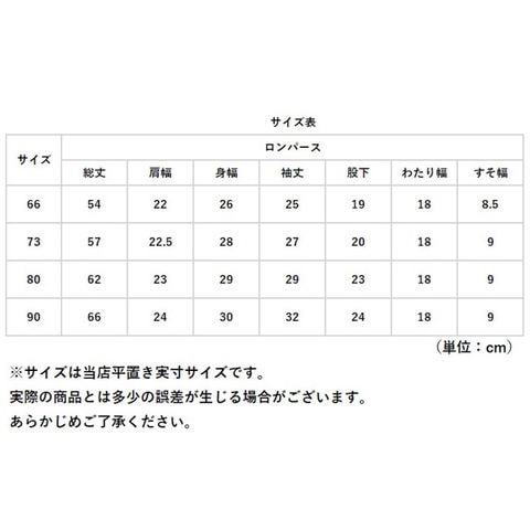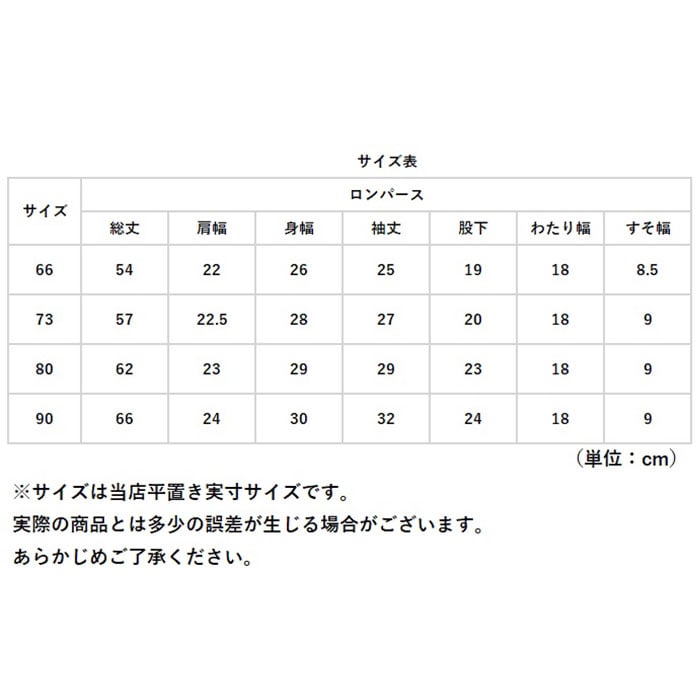 | サイズ | [ベビー] ・66cm ・73cm ・80cm ・90cm ※サイズについて詳細は、商品画像の中にあるサイズ表をご覧くださいませ。 |