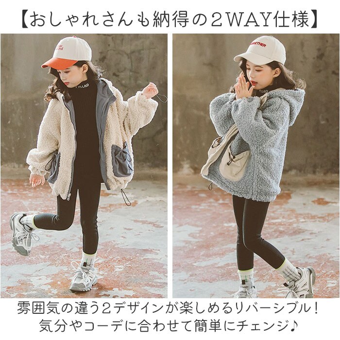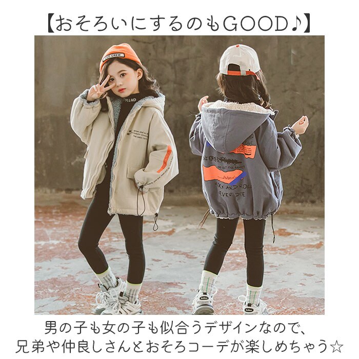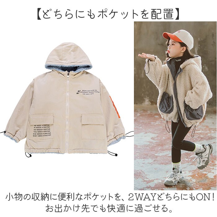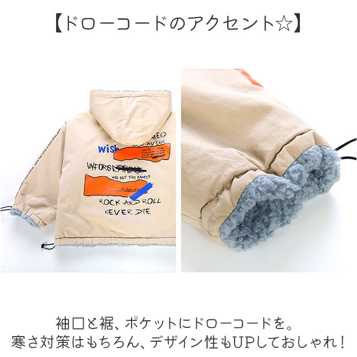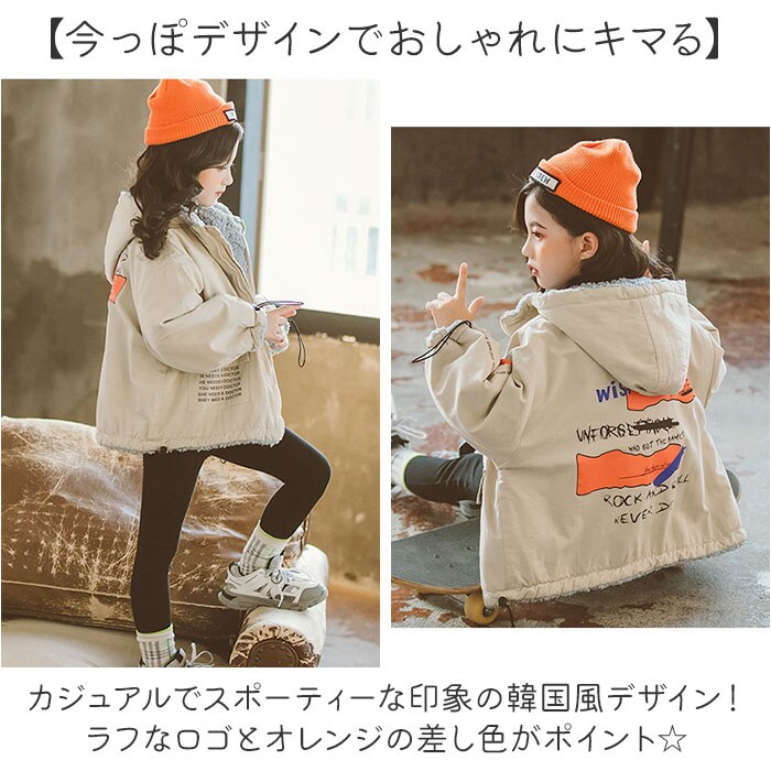 | 商品説明 | 【ボアも楽しめる2WAY着こなし☆】韓国風コーデが完成する、トレンドアウター!「ボアコート キッズ」が登場。【身体を包むあったかアウター☆】ふかふかであたたかなボアをプラスした、冬にぴったりのアイテム。お出かけも通学もお任せ☆【おしゃれさんも納得の2WAY仕様】雰囲気の違う2デザインが楽しめるリバーシブル!気分やコーデに合わせて簡単にチェンジ♪【今っぽデザインでおしゃれにキマる】カジュアルでスポーティーな印象の韓国風デザイン!ラフなロゴとオレンジの差し色がポイント☆【どちらにもポケットを配置】小物の収納に便利なポケットを、2WAYどちらにもON!お出かけ先でも快適に過ごせる。【ドローコードのアクセント☆】袖口と裾、ポケットにドローコードを。寒さ対策はもちろん、デザイン性もUPしておしゃれ!【おそろいにするのもGOOD♪】男の子も女の子も似合うデザインなので、兄弟や仲良しさんとおそろコーデが楽しめちゃう☆ |