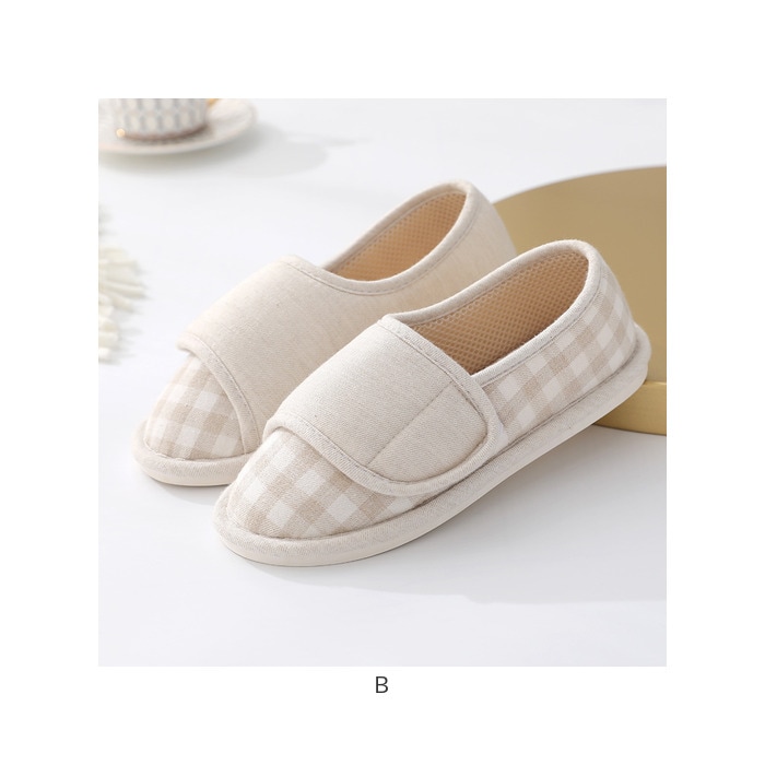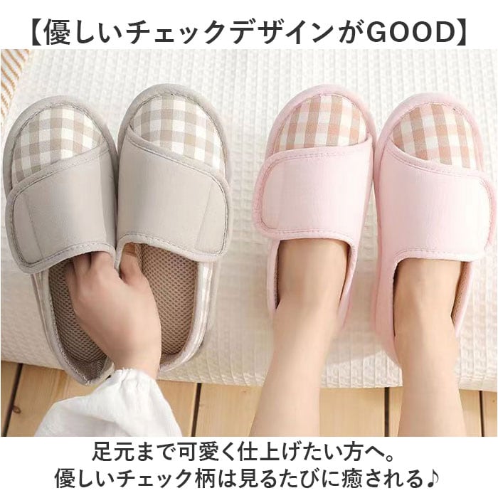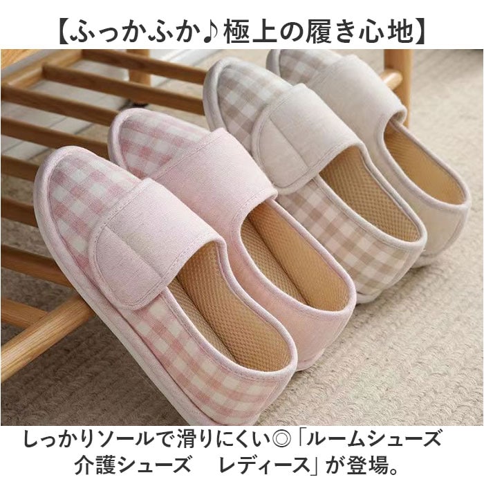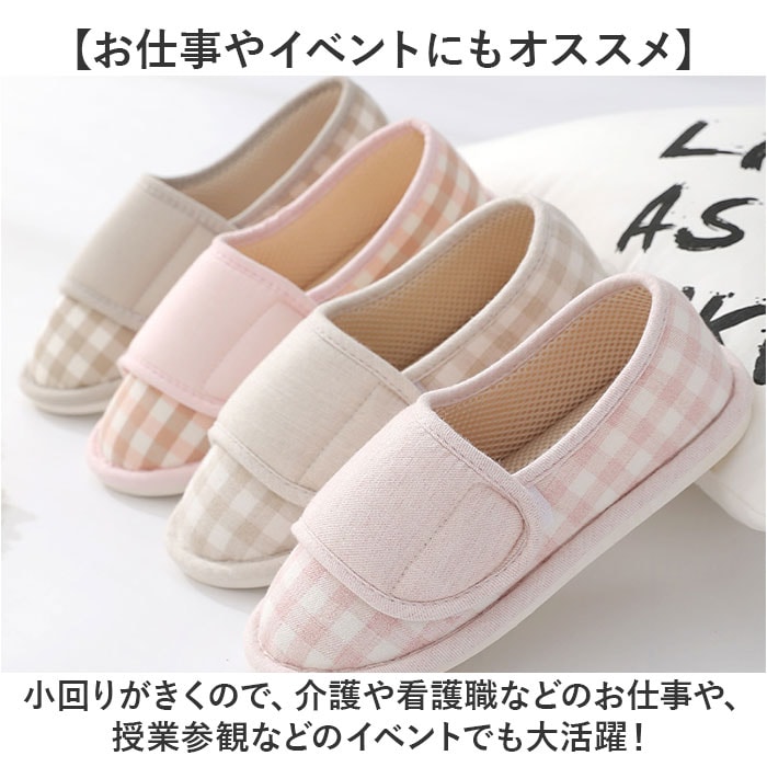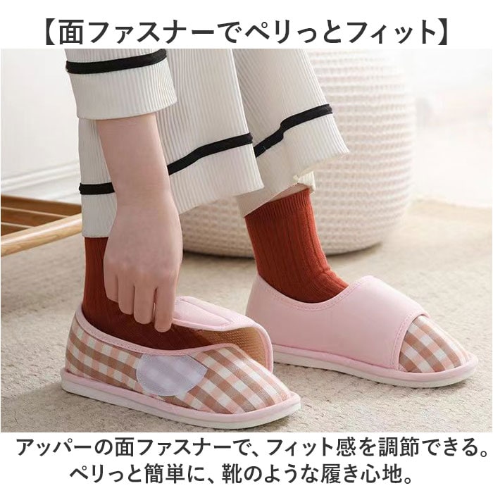 | 商品説明 | 【ふっかふか♪極上の履き心地】しっかりソールで滑りにくい◎「ルームシューズ 介護シューズ レディース」が登場。【パカパカせずに歩きやすい◎】パカパカしたり脱げたりしにくい、かかと付き。かかとまで包み込むから、足元あったか♪【ふかふかのコットン生地を使用】足を優しく包み込む、ふかふかの作りが魅力。こだわりの通気性で、ムレにくくお肌に優しい。【フローリングも安心の滑り止め】滑り止めを加工した足裏は、1cmとしっかり厚めの仕様。フローリングも安定するから歩きやすい【面ファスナーでペリっとフィット】アッパーの面ファスナーで、フィット感を調節できる。ペリっと簡単に、靴のような履き心地。【足先を冷やさず女性に優しい☆】床の冷えをブロックするアウトソール。つま先からかかとまですっぽりカバーして熱を逃さない◎【優しいチェックデザインがGOOD】足元まで可愛く仕上げたい方へ。優しいチェック柄は見るたびに癒される♪【お仕事やイベントにもオススメ】小回りがきくので、介護や看護職などのお仕事や、授業参観などのイベントでも大活躍! |