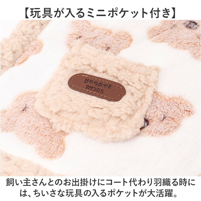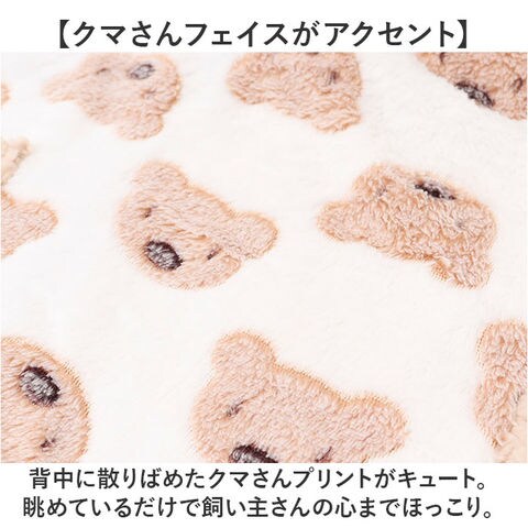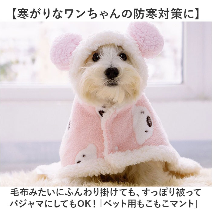 | 商品説明 | 【寒がりなワンちゃんの防寒対策に】毛布みたいにふんわり掛けても、すっぽり被ってパジャマにしてもOK!「ペット用もこもこマント」【寒さに負けない!もこもこボア】すっぽり被れるフードもふわっと軽いマントも、もこもこボアで仕上げたぽかぽかの防寒スリーパー。【豊かな毛足で暖かさをキープ】マント内側の柔らかな肌触りのボアの毛足が、身体の周りの暖かい空気を逃がさず、保温性抜群!【スナップボタンでふわっと装着】ワンちゃんの背中にマントを被せて前合せのスナップを留めるだけ!着脱がスムーズで嫌がらない♪【ふわっとかぶれるフード付き】しんしんと冷える夜はまんまるお耳のクマさんに変身!冷えやすいお耳をすっぽり包んで防寒性UP!【活発なワンちゃんでも大丈夫】遊ぶのが大好きなワンちゃんは、お腹のスナップを留めてあげるとマントが脱げづらくなって安心。【お布団みたいに敷いて寝冷え防止】ペットベッドやペットヒーターの上に広げて敷いておくだけで、ぬくぬくのブランケットにも◎【ご家庭でカンタンお洗濯♪】取り扱いの楽なフリース素材なので手軽にお洗濯OK!こまめなお洗濯でいつでも清潔な着心地。【玩具が入るミニポケット付き】飼い主さんとのお出掛けにコート代わり羽織る時には、ちいさな玩具の入るポケットが大活躍。【愛犬のサイズに合わせてチョイス】超小型犬~中型犬まで、ふんわり優しく身に纏える、S・M・Lサイズの3サイズ展開。【クマさんフェイスがアクセント】背中に散りばめたクマさんプリントがキュート。眺めているだけで飼い主さんの心までほっこり。 |