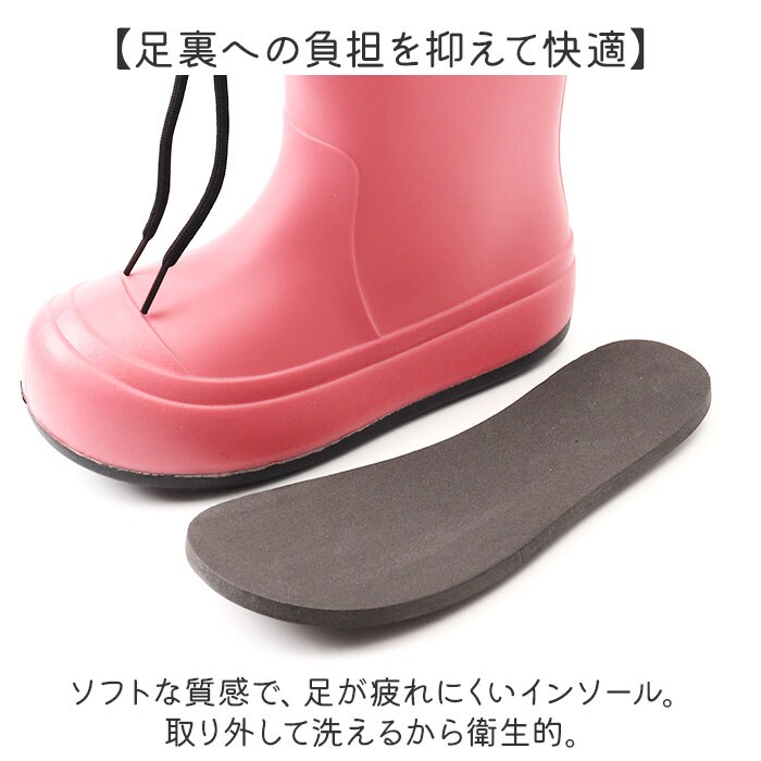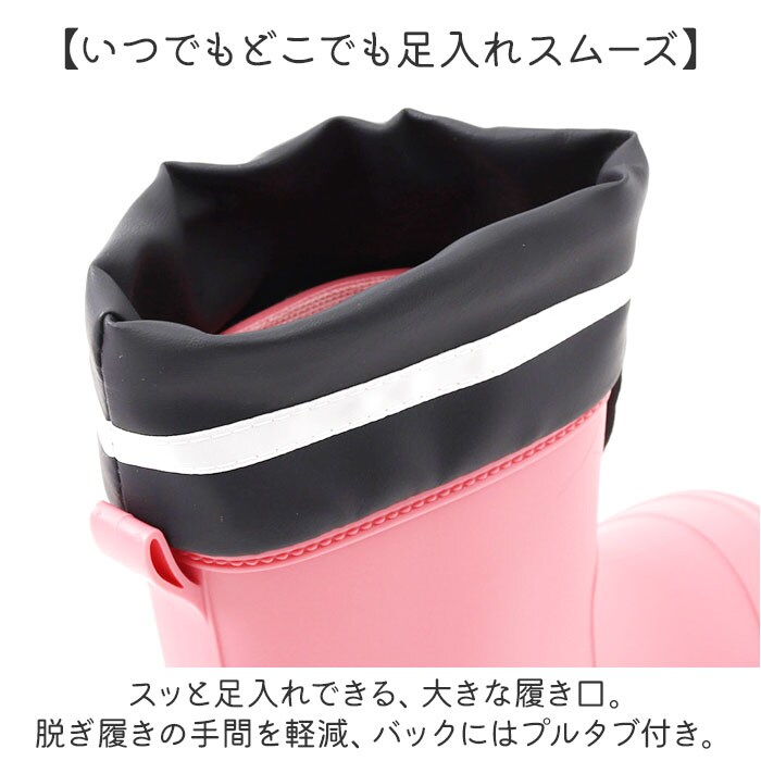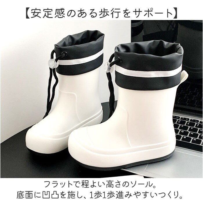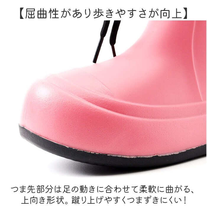 | 商品説明 | 【憂鬱な雨の日も元気にお出かけ】靴の水濡れを気にせず、アクティブにGO☆雨の日はお任せ!「キッズ用レインブーツ」。【いつでもどこでも足入れスムーズ】スッと足入れできる、大きな履き口。脱ぎ履きの手間を軽減、バックにはプルタブ付き。【自分サイズにフィットして脱げない】履き口のコードをキュッと絞って調節。沢山歩いたり遊んでも、脱げにくく安全◎【水に強くお手入れ簡単】表面は水に強い素材で、雨の日はもちろんキャンプなどにも最適。お手入れも拭き取るだけ。(※)完全防水ではありません。【足裏への負担を抑えて快適】ソフトな質感で、足が疲れにくいインソール。取り外して洗えるから衛生的。【屈曲性があり歩きやすさが向上】つま先部分は足の動きに合わせて柔軟に曲がる、上向き形状。蹴り上げやすくつまずきにくい!【安定感のある歩行をサポート】フラットで程よい高さのソール。底面に凹凸を施し、1歩1歩進みやすいつくり。【お気に入りを選べるカラー】男の子も女の子も選べるカラーをラインナップ。飽きのこないシンプルなデザイン◎ |