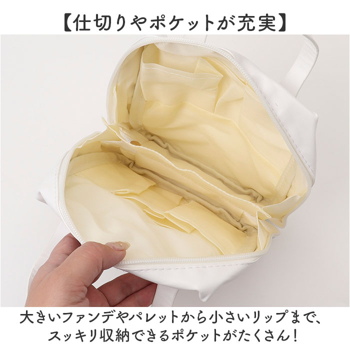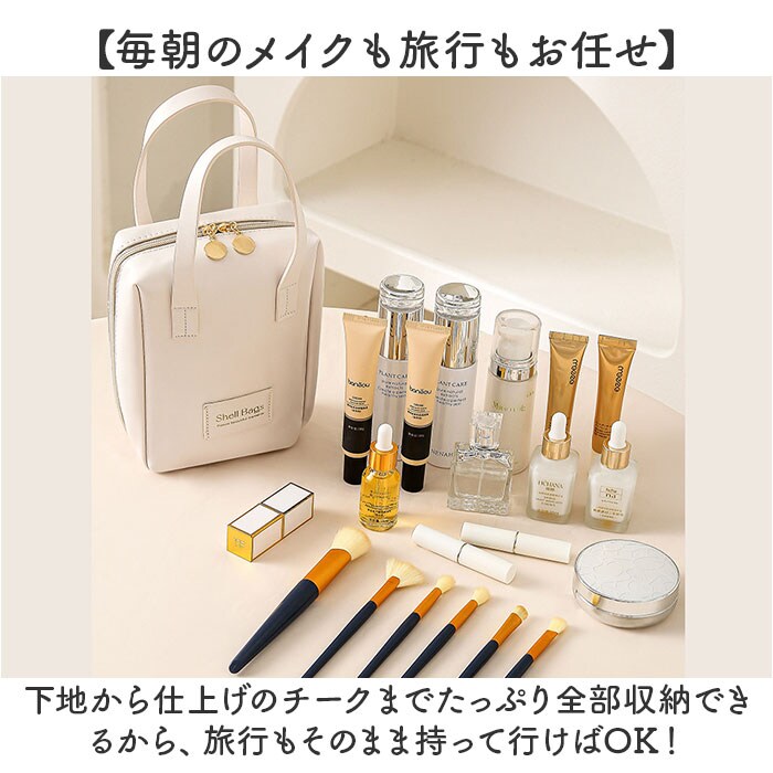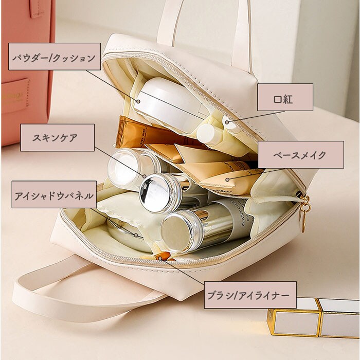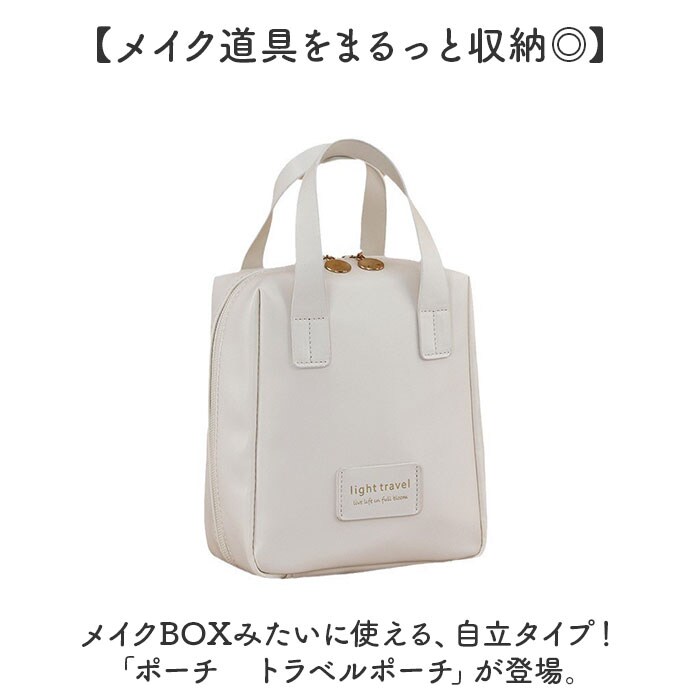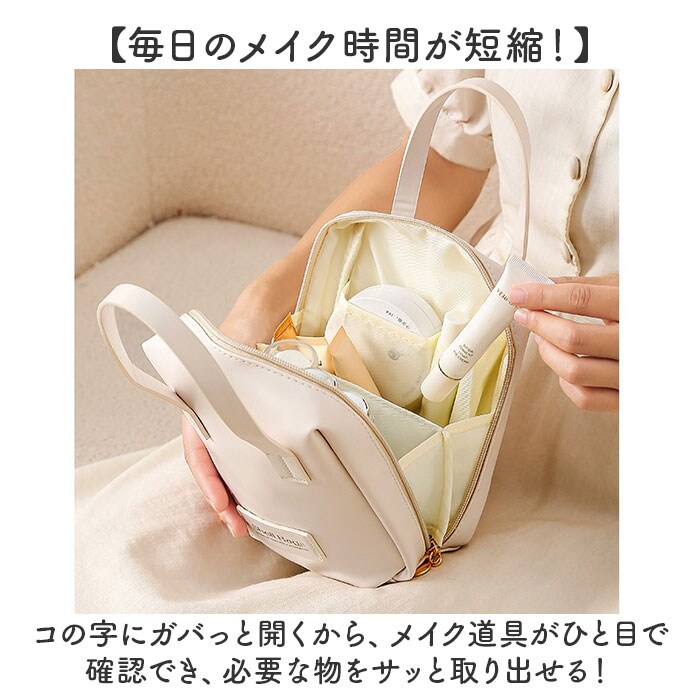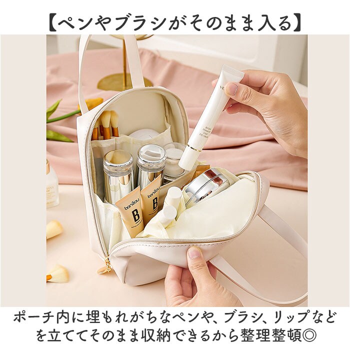 | 商品説明 | 【メイク道具をまるっと収納◎】メイクBOXみたいに使える、自立タイプ!「ポーチ トラベルポーチ」が登場。【自立&スクエア型が使いやすい!】立てたまま整理ができる、自立タイプ!メイクBOXみたいな使い心地が快適で便利◎【毎日のメイク時間が短縮!】コの字にガバっと開くから、メイク道具がひと目で確認でき、必要な物をサッと取り出せる!【ペンやブラシがそのまま入る】ポーチ内に埋もれがちなペンや、ブラシ、リップなどを立ててそのまま収納できるから整理整頓◎【仕切りやポケットが充実】大きいファンデやパレットから小さいリップまで、スッキリ収納できるポケットがたくさん!【毎朝のメイクも旅行もお任せ】下地から仕上げのチークまでたっぷり全部収納できるから、旅行もそのまま持って行けばOK!【洗面台で使えて汚れにも強い】外布は撥水加工を施し、水濡れに強い仕様。汚れもサッと拭きとれるので、お手入れも簡単。【持ち運びがしやすいハンドルつき】旅行や温泉、プールに持って行きやすい、手持ちハンドルつき!バッグみたいな見た目が可愛い☆【ポケット仕様】オープンポケット×6 |