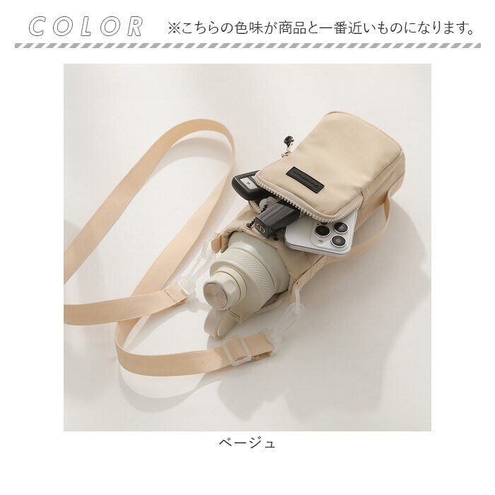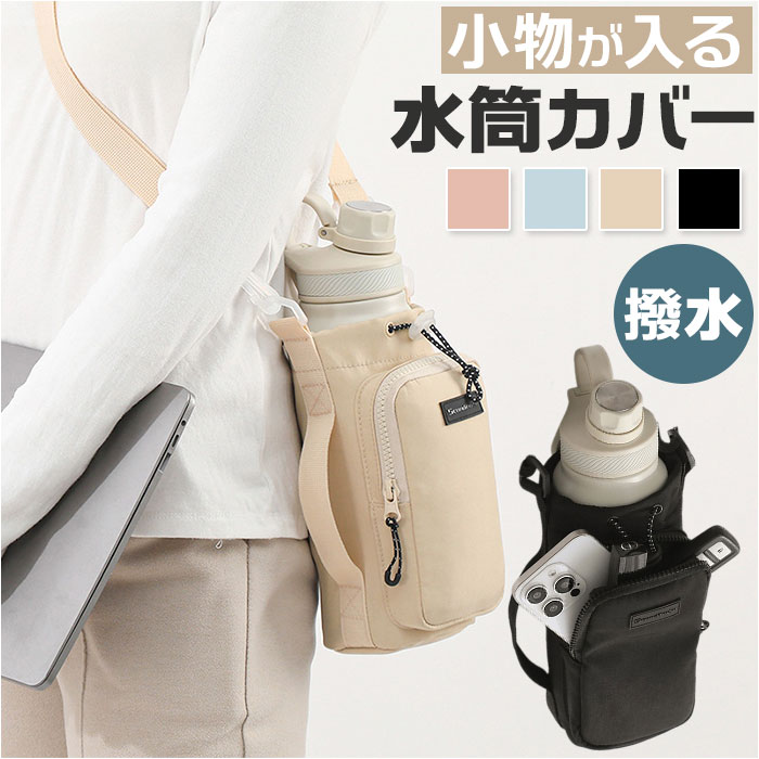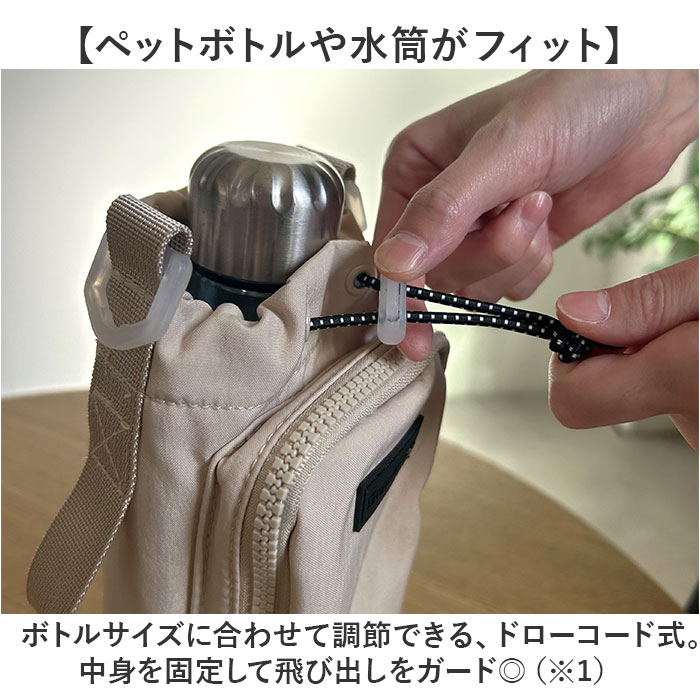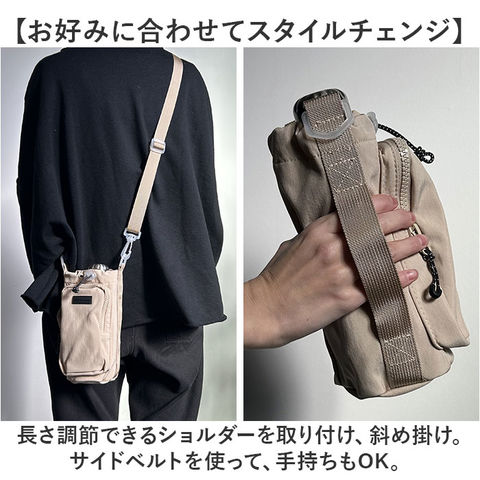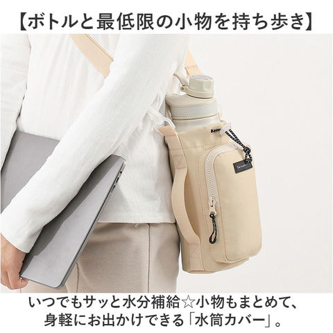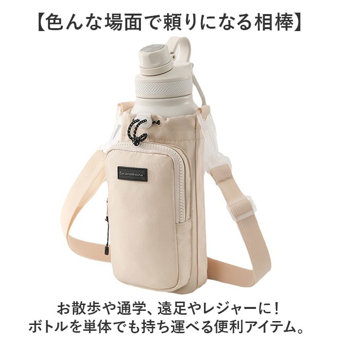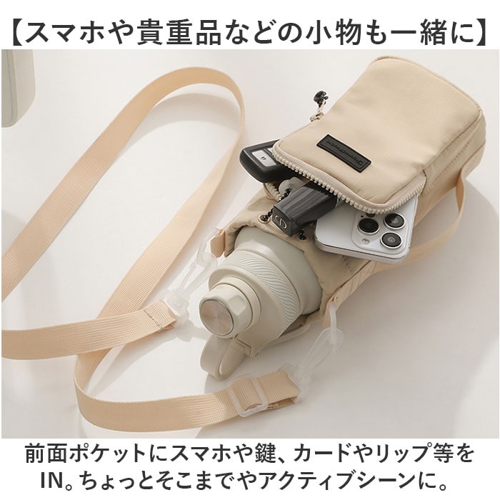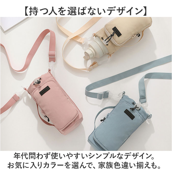 | 商品説明 | 【ボトルと最低限の小物を持ち歩き】いつでもサッと水分補給☆小物もまとめて、身軽にお出かけできる「水筒カバー」。【色んな場面で頼りになる相棒】お散歩や通学、遠足やレジャーに!ボトルを単体でも持ち運べる便利アイテム。【お好みに合わせてスタイルチェンジ】長さ調節できるショルダーを取り付け、斜め掛け。サイドベルトを使って、手持ちもOK。【ペットボトルや水筒がフィット】ボトルサイズに合わせて調節できる、ドローコード式。中身を固定して飛び出しをガード◎(※1)当店計測サイズにより、直径約9cmほどのボトルに対応。ボトルの形状などにより、収納できない場合があります。【スマホや貴重品などの小物も一緒に】前面ポケットにスマホや鍵、カードやリップ等をIN。ちょっとそこまでやアクティブシーンに。【ちょっとの雨なら大丈夫】汚れや水滴を弾きやすい、撥水加工済み。お手入れも拭き取るだけ。(※2)完全防水ではありません。【持つ人を選ばないデザイン】年代問わず使いやすいシンプルなデザイン。お気に入りカラーを選んで、家族色違い揃えも。【ポケット仕様】前面:ファスナーポケット×1 |