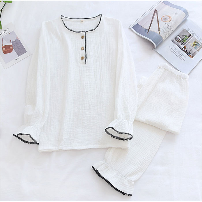 | 商品説明 | 【お家の中でも可愛くいたい女性に】お気に入りのアイテムで、心地よくリラックス♪レディース用「ダブルガーゼ パジャマ」。【ロングシーズン使えて万能】肌寒い日や季節の変わり目に。冷房による冷え対策にもぴったりな長袖タイプ。【ふんわり柔らかなコットンガーゼ】肌当たりの優しい、2重ガーゼ生地を使用。チクチク感がなくデリケート肌でも安心。【汗ばむ季節もサラッと快適】吸湿性と通気性に優れており、汗をかいてもムレにくいのが嬉しい!【動きやすく、心地よいフィット感】袖と裾部分はゴム入り。手首と足首に優しく馴染んで動きを妨げず、腕まくりなどもスムーズ。【心地よく眠れるゆっったりトップス】頭から被ってハーフボタンを留めるだけ。身幅に余裕をもたせ、首元も詰まりすぎないデザイン。【ストレスなく履けるロングパンツ】締めつけ感のないウエストゴム仕様。スッと足を通せて、着替えもラクチン。【落ち着きのある大人可愛いデザイン】シンプルな中に、ちょこっとガーリー感をプラス♪お泊り会などにもおすすめ! |